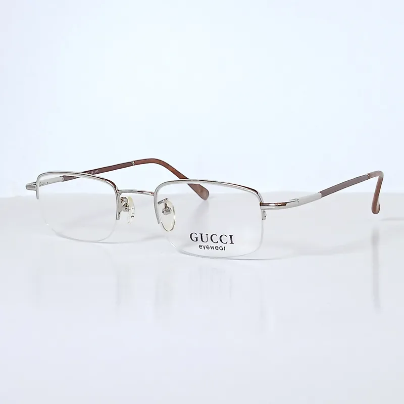 عینک طبی نیم گریف GUCCI مدل 020 نسبتا قدیمی با ظاهری کلاسیک و ساده،سبک ساخته شده از استیل و دست های با لولای فنری نرم و روان با پدهای متحرک ژلا تینی برای فیکس شدن روی بینی،مناسب برای استفاده روزانه و عینک مطالعه و کیفیت خوب و قیمت مناسب در دو رنگ استیلی(نقره ای) و طلائی .