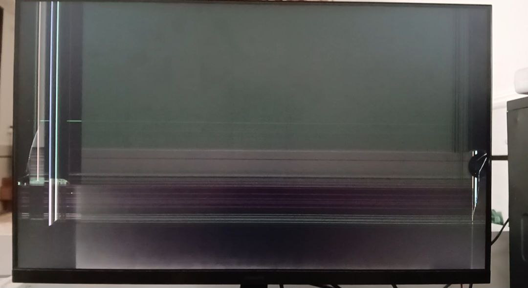 این مانیتور از روی میز افتاده و پنلش شکسته. روشن میشه ولی تصویر خطوط و خرابی داره (توی عکس مشخصه).
