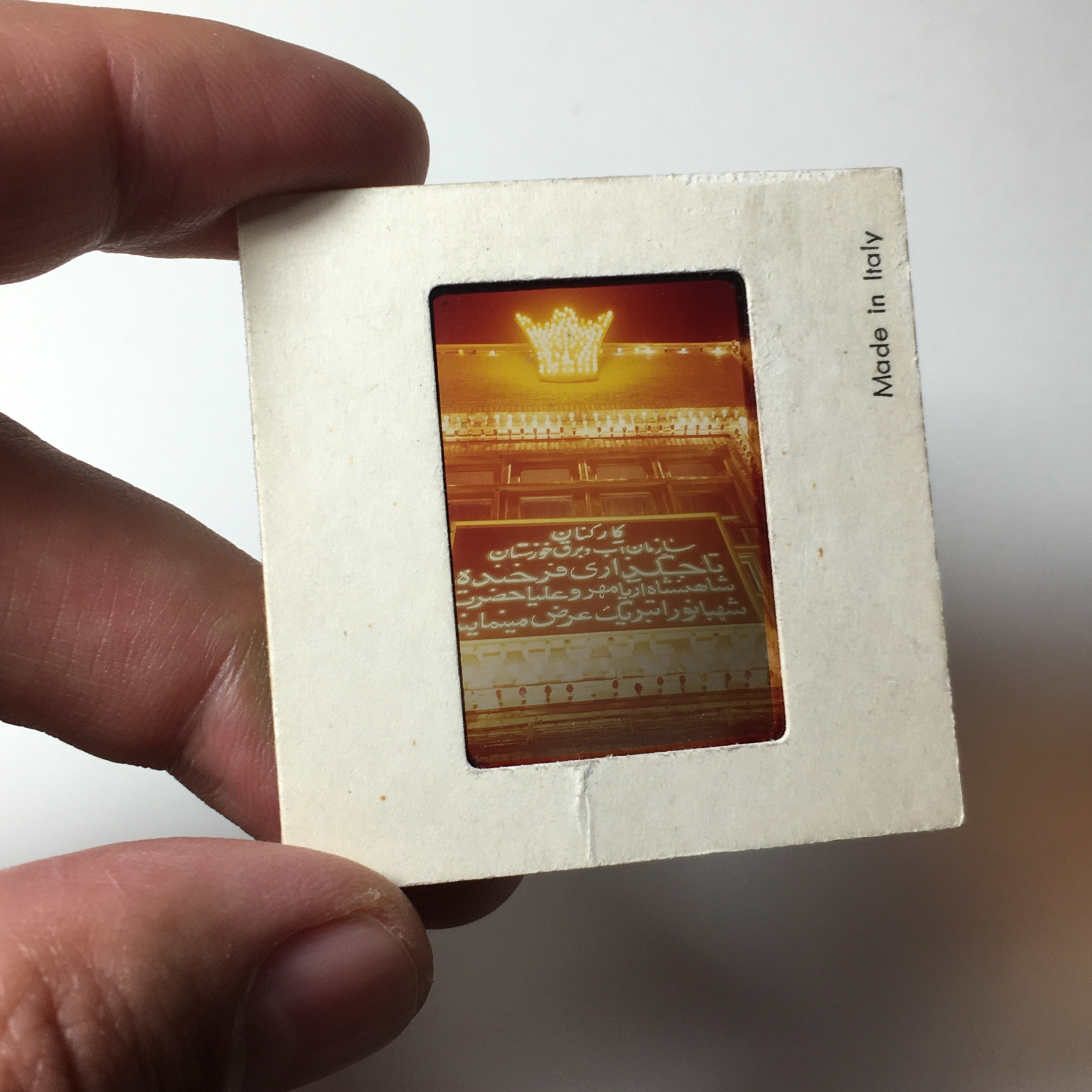 یک عدد اسلاید فیلم اورجینال کداک (ساخت ایتالیا) مربوط به مراسم تاجگذاری شاهنشاه محمدرضا پهلوی و فرح پهلوی فرح پهلوی 4 آبان سال 1346 (1967 میلادی).