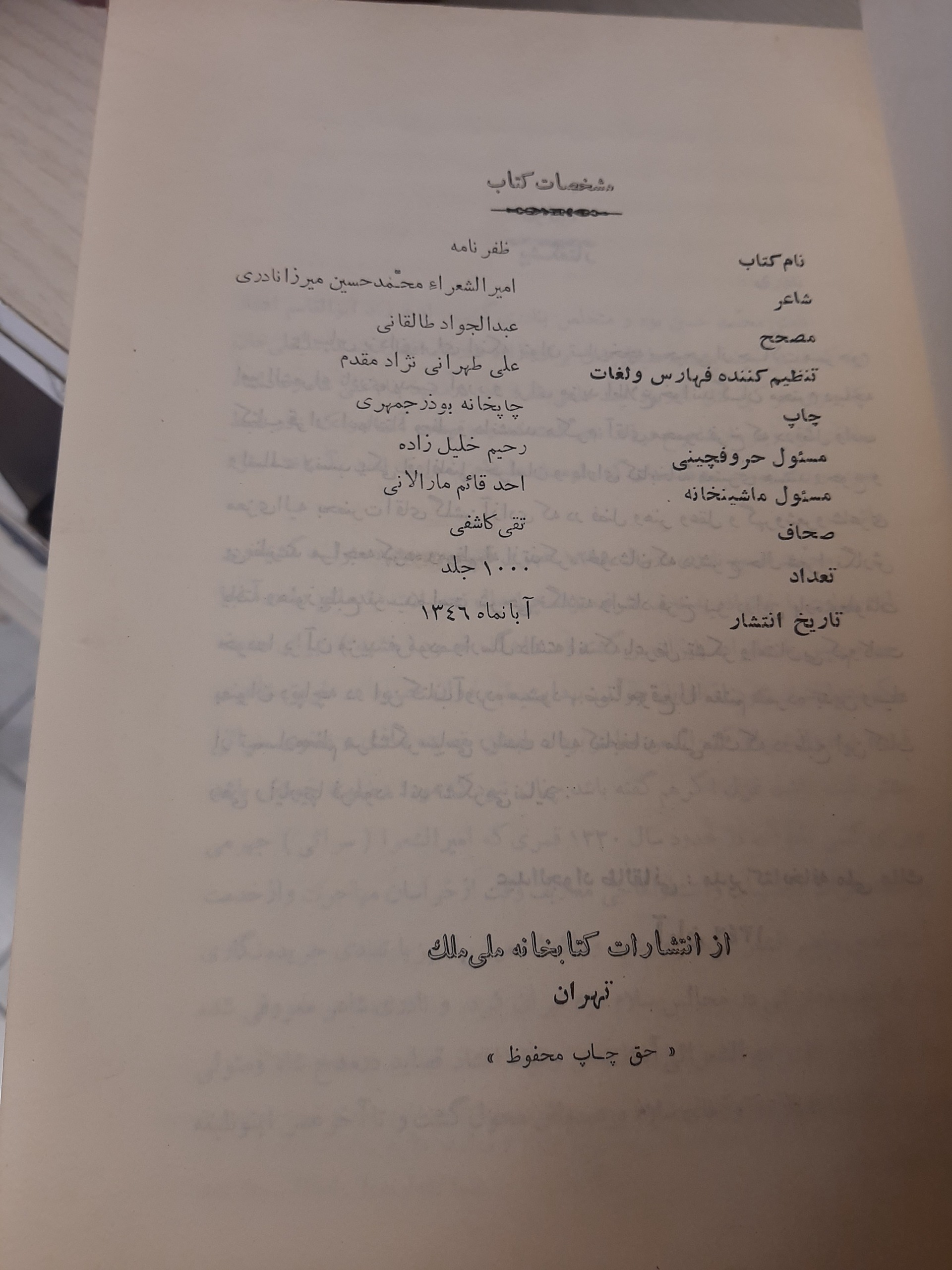 کتاب ظفرنامه از انتشارات کتابخانه ملی ملک چاپ سال هزار و سیصد و چهل و شش اثری تاریخی و ادبی درباره شرح زندگی و فتوحات امیر تیمور گورکانی است که به نظم در آمده و وقایع دوران او را بازگو می کند این کتاب شامل شرح جنگها و لشکرکشیها پیروزیها و شکستهای نظامی روابط تیمور با پادشاهان و فرمانروایان سرزمینهای مختلف و همچنین اوضاع اجتماعی و فرهنگی آن دوران است در کنار توصیف نبردها به ستایش دلاوریها و تدابیر سیاسی تیمور پرداخته و تصویری از جهان اسلام و سرزمینهای شرق در سده های هشتم و نهم هجری ارائه می دهد و نثر و نظم آن آمیزه ای از تاریخ و حماسه است.