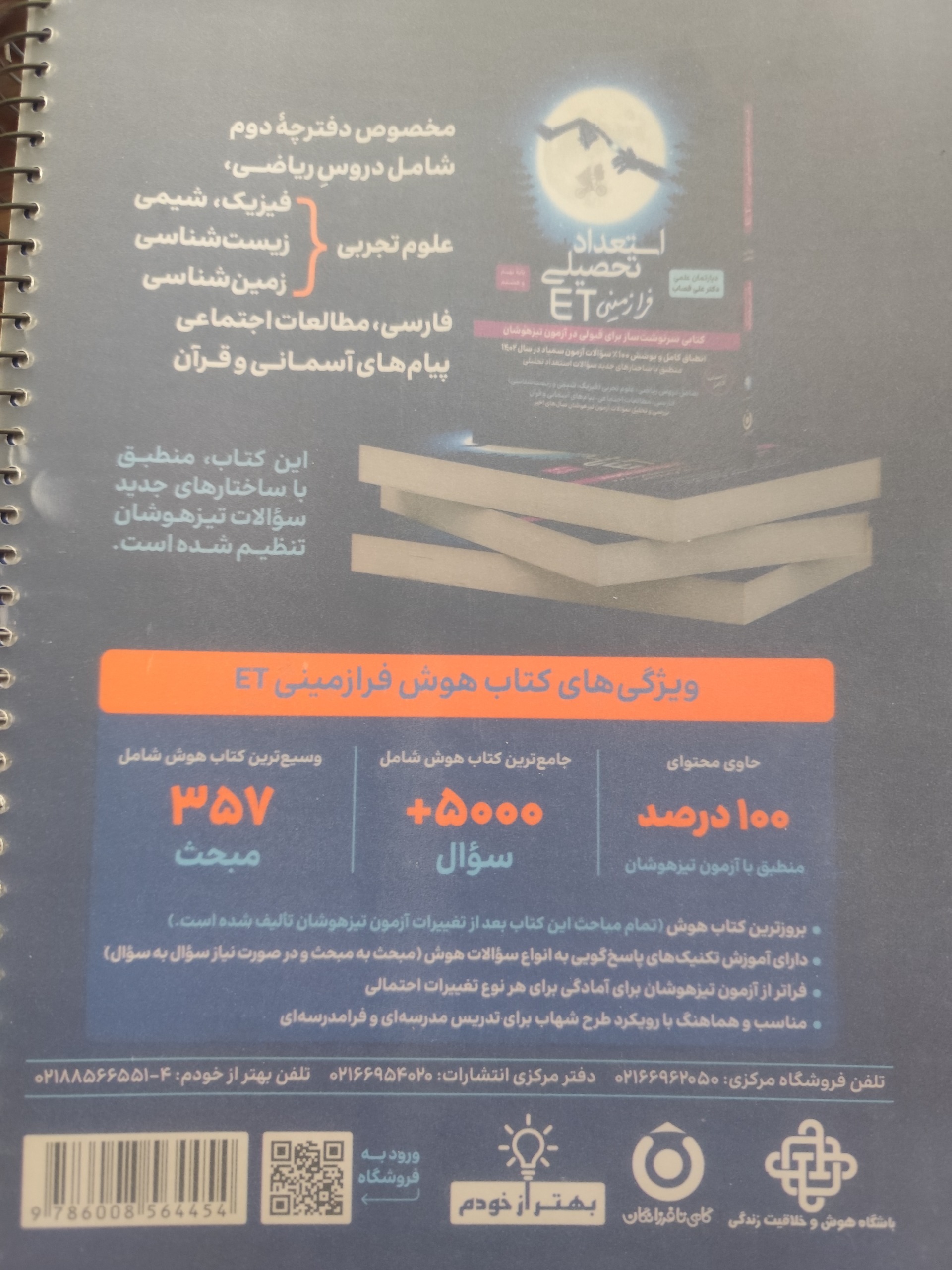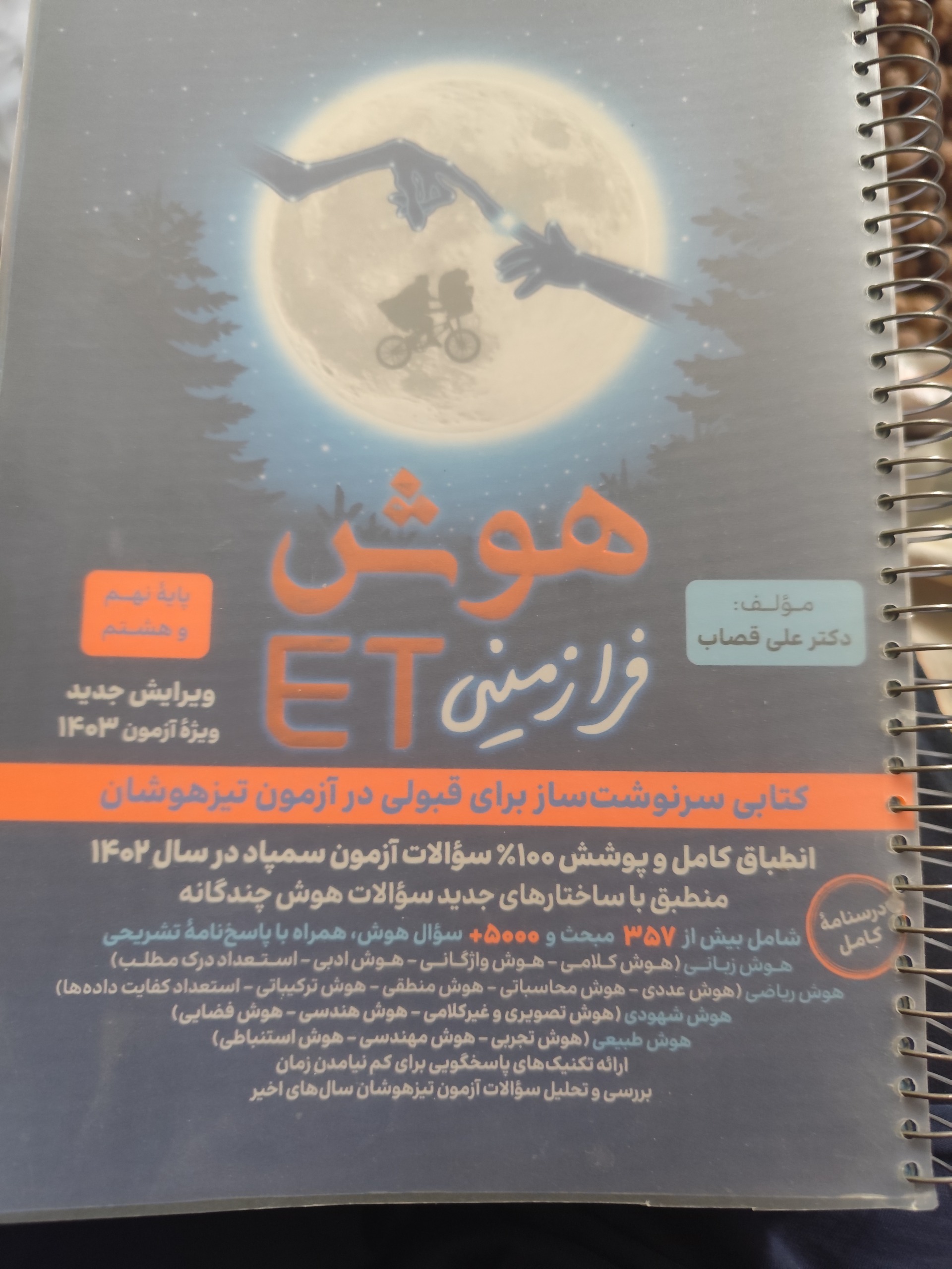 سلام به بازدیدکنندگان عزیز و گرامی این کتاب کتابی سرنوشت ساز برای قبولی در آزمون تیزهوشان نهم به دهم که دارای درسنامه کامل به علاوه پاسخنامه کامل و جامع و دارای مثبت 357 مباحث و مثبت 5 هزار تست سوال هوش باشد که از هوشهای زبانی و ریاضی و شهودی و طبیعی و ... را در بر میگرد . و اینکه این کتاب تقریبا یک چهارم کتاب نوشته شده و بقیه خالی هستش.