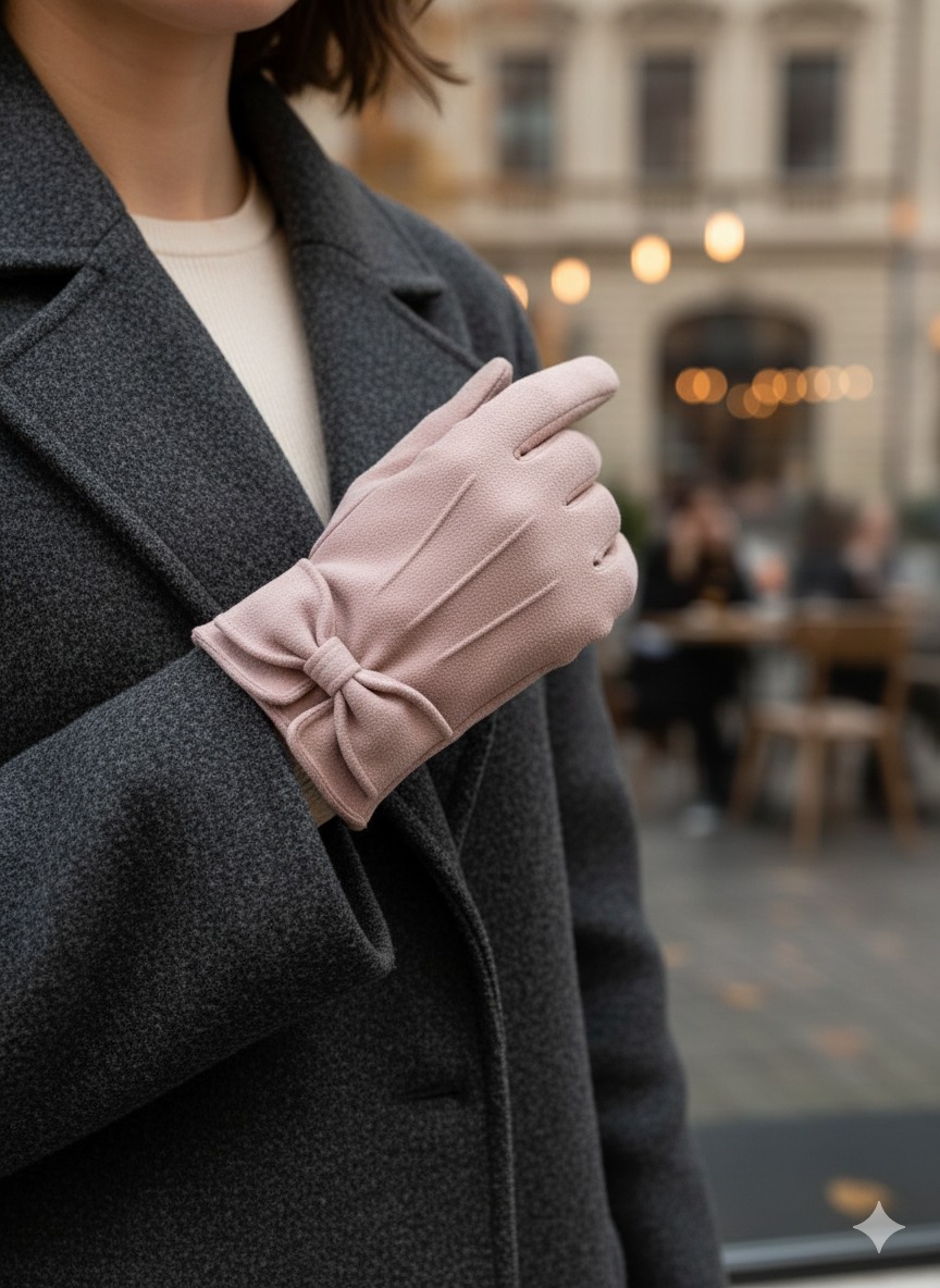 • استایل کژوال و روزمره: برای یک استایل راحت و روزمره، این دستکشها را با یک ژاکت بافتنی اورسایز به رنگ کرم، شلوار جین و یک جفت کتانی ست کنید. این ترکیب برای یک روز پاییزی در پارک یا خرید مناسب است. رنگ صورتی پودری دستکشها، یک کنتراست زیبا و جذاب با رنگهای خنثی ایجاد میکند.
