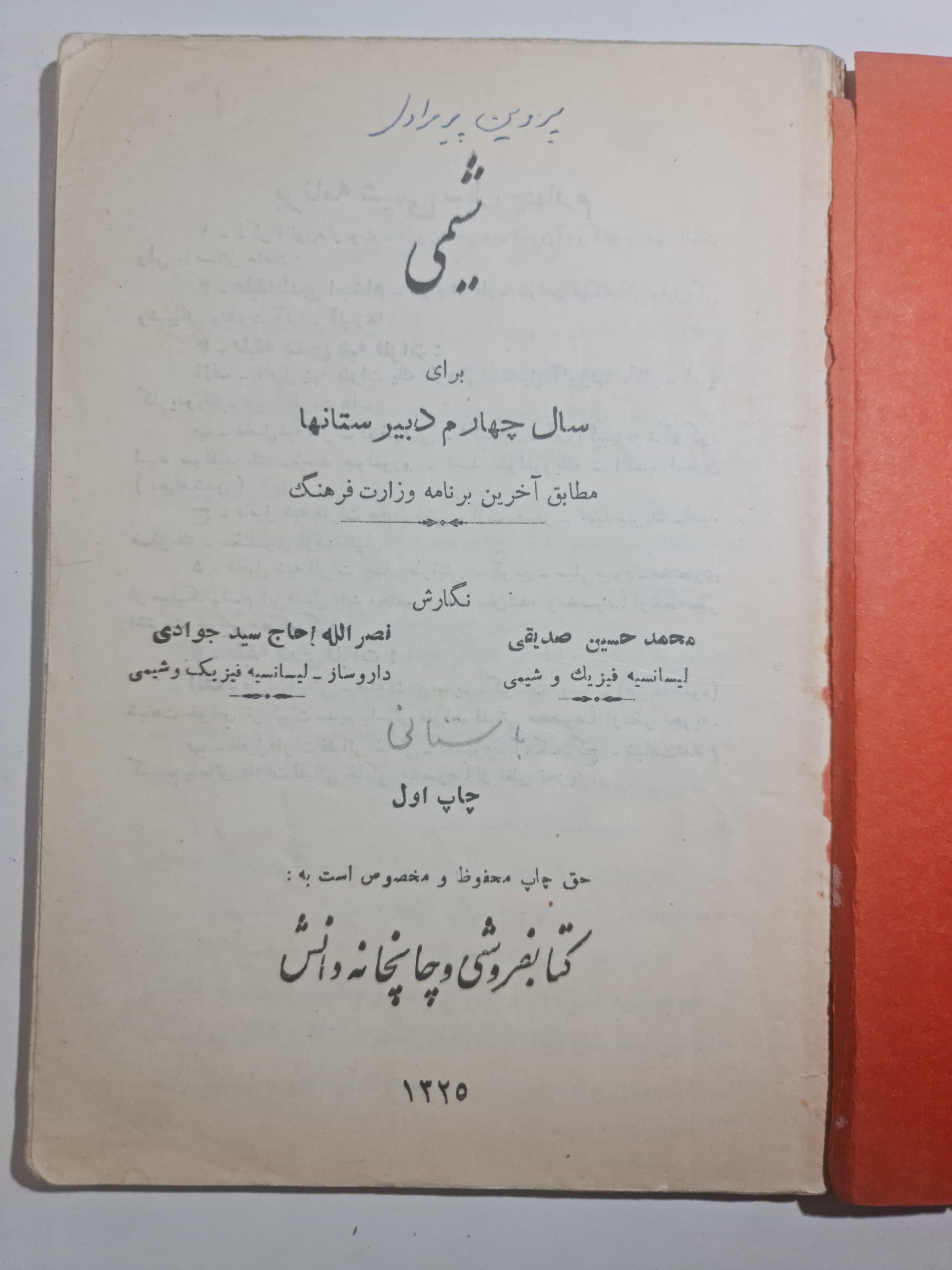 یک جلد کتاب شیمی سال چهارم دبیرستان سال چاپ 1325 شمسی