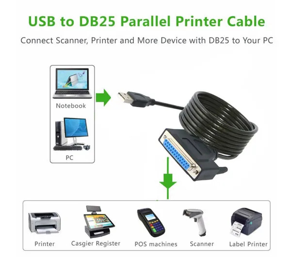 مادربوردها و لپ تاپ های جدید فاقد پورت پارالل هستند و توسط این تبدیل USB به 25 پین ماده پارالل میتوان دستگاههایی مثل پرینتر و اسکنر و پرینتر حرارتی و که دارای پورت پارالل 25 پین میباشند را از طریق USB به لپ تاپ و کامپیوتر متصل کرد.