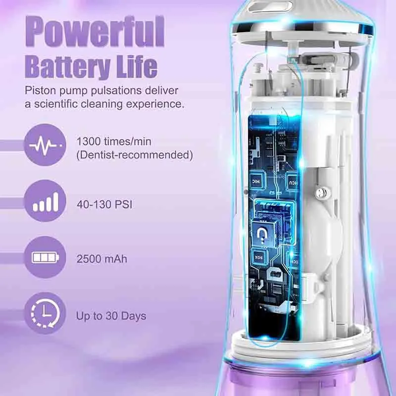 قابل حمل و عمر طولانی با اندازه قابل حمل و وزن سبک، دستگاه نخ دندان Luminor میتواند برای سفرهای شما فراهم کند. با استفاده از یک باتری لیتیومی 2500 میلیآمپر ساعتی با قدرت کافی، میتوانم با یک شارژ کامل 4-5 ساعته، به مدت 15 تا 30 روز به طور مداوم از آن استفاده