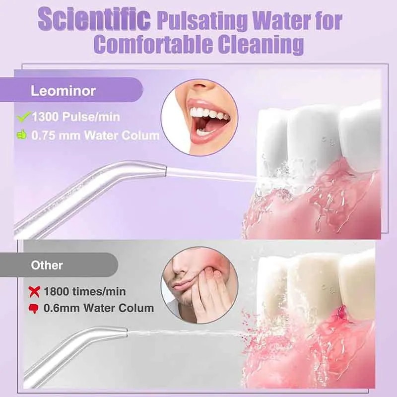 تمیز کردن کامل و عمیق دندانها با بهرهگیری از جدیدترین فناوری جریان آب پالسی 2022، موتور باکیفیت با 1200 تا 1400 بار ضربان آب در دقیقه و نازل قابل چرخش 360 درجه، دستگاه واترفلاسر Luminor تا 99.99 درصد از بقایای مواد غذایی را در هر گوشهای از دندانها میکند.