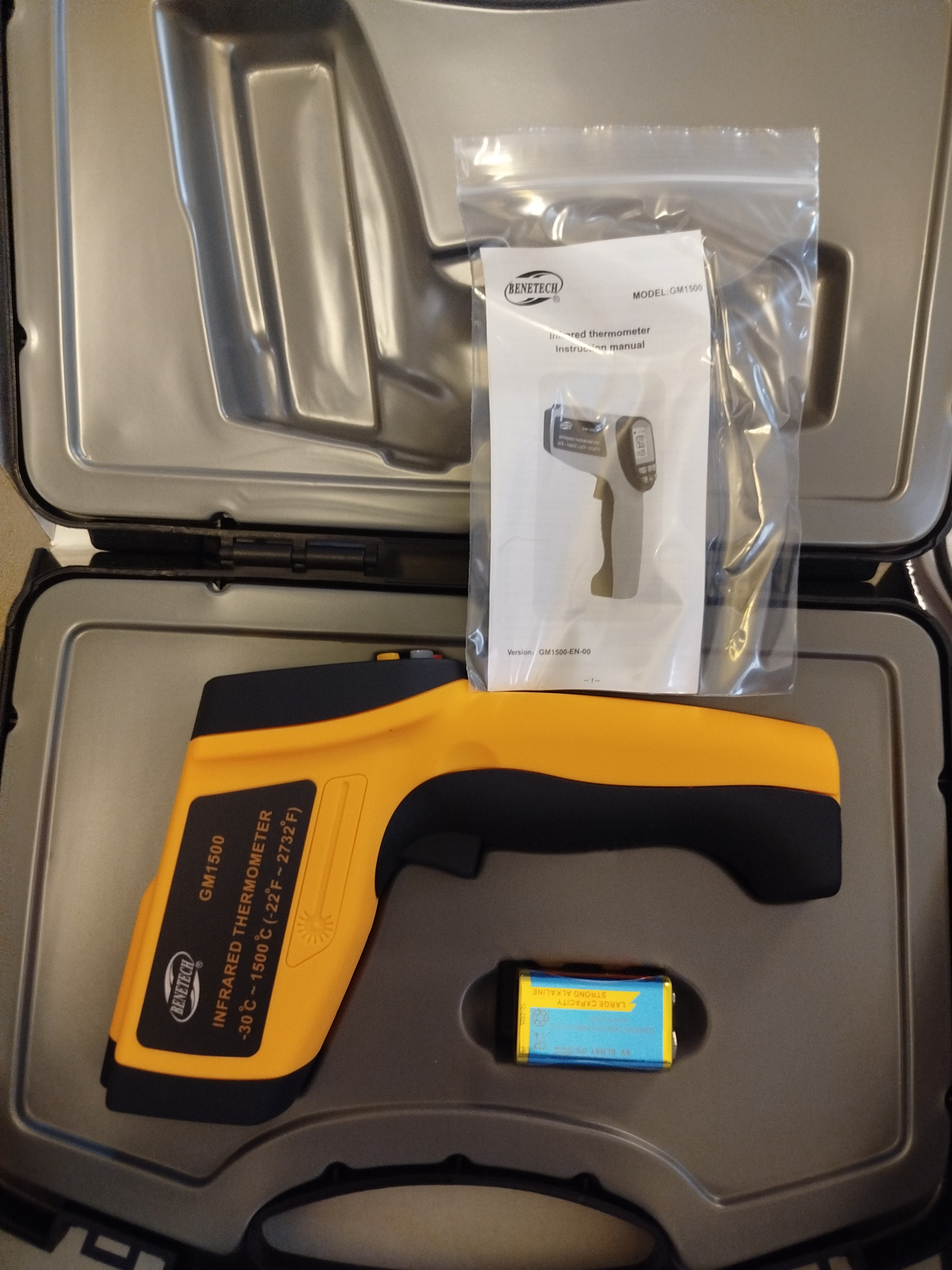 ترمومتر اینفرارد GM1500 با دقت و سرعت بالا مناسب اندازهگیری دمای اجسام بسیار داغ˛ خطرناک و غیرقابل دسترس است و میتواند دما را تا 1500 درجه سانتیگراد (2732 فارنهایت) اندازه بگیرد. علاوهبراین میتواند مقدار کمینه˛ بیشینه˛ متوسط و تفاضلی دماهای اندازهگیری شده را محاسبه کند. صفحه نمایش LCD این ترمومتر با دارا بودن نور صفحه نمایش قابلیت نمایش هشدار کاهش باتری˛ کمترین دما و بیشترین دما و تعیین مکان داغترین نقطه در سطح جسم را نیز دارد. این ترمومتر میتواند تا 80 گروه از دادهها را در حافظه ذخیره کند. قابلیت دیگر این ابزار خاموشی خودکار و data hold است. ضریب گسیلش در این ترمومتر از 0.1 تا 1 متغیر بوده و فاصله اندازهگیری 50:1 است.