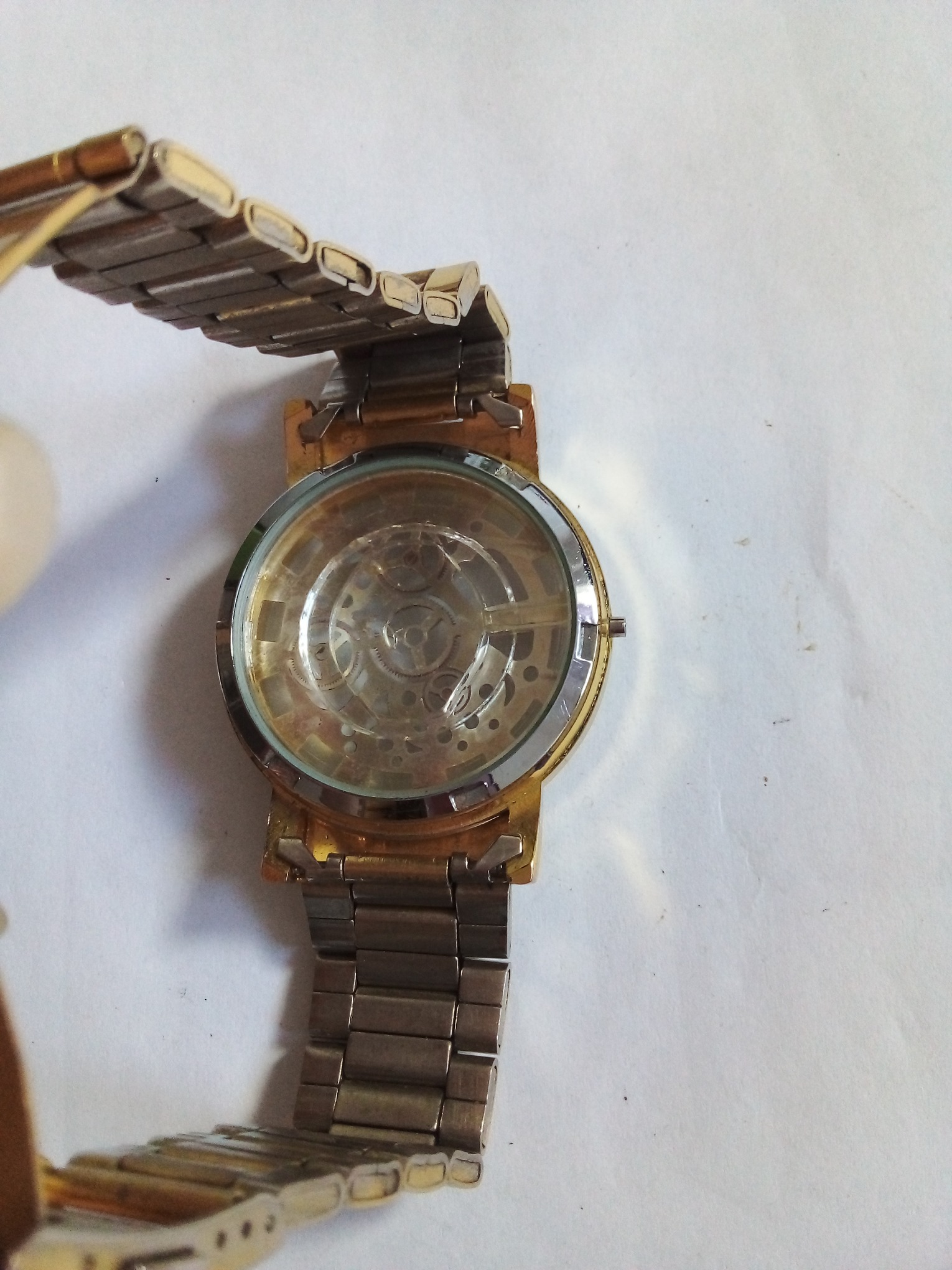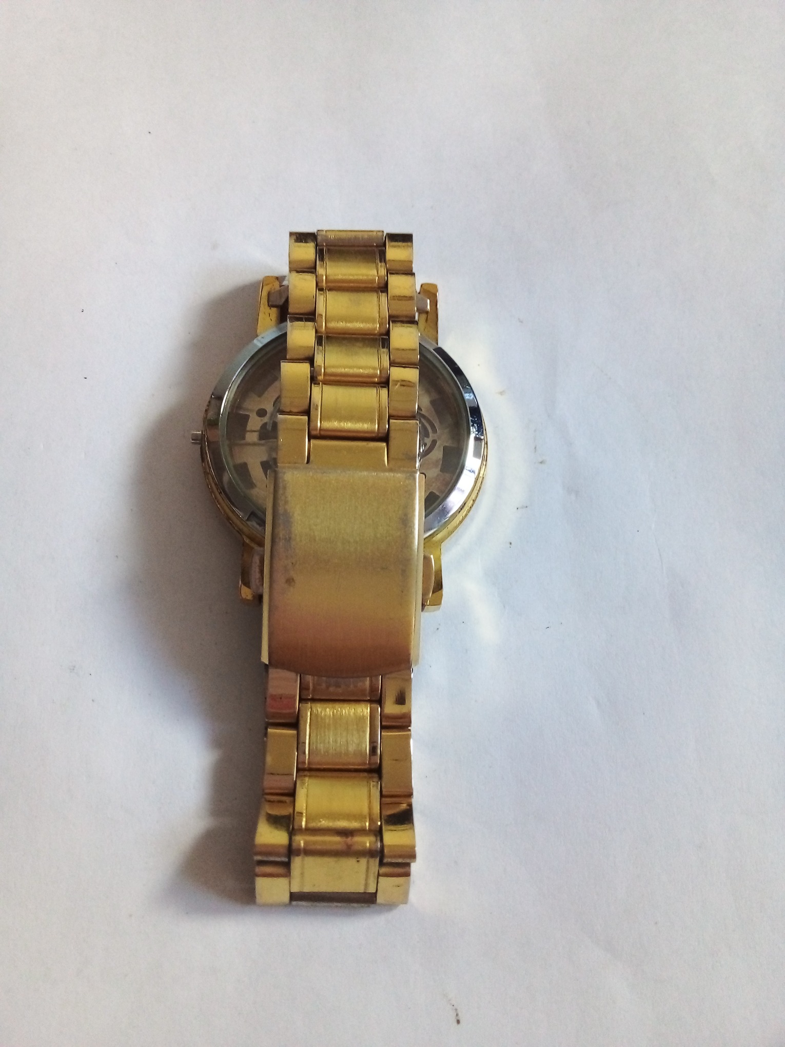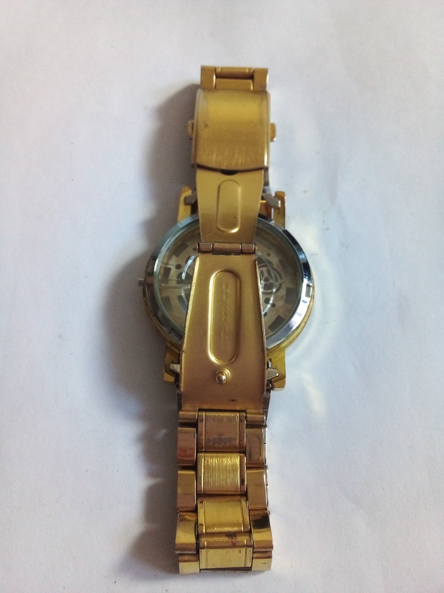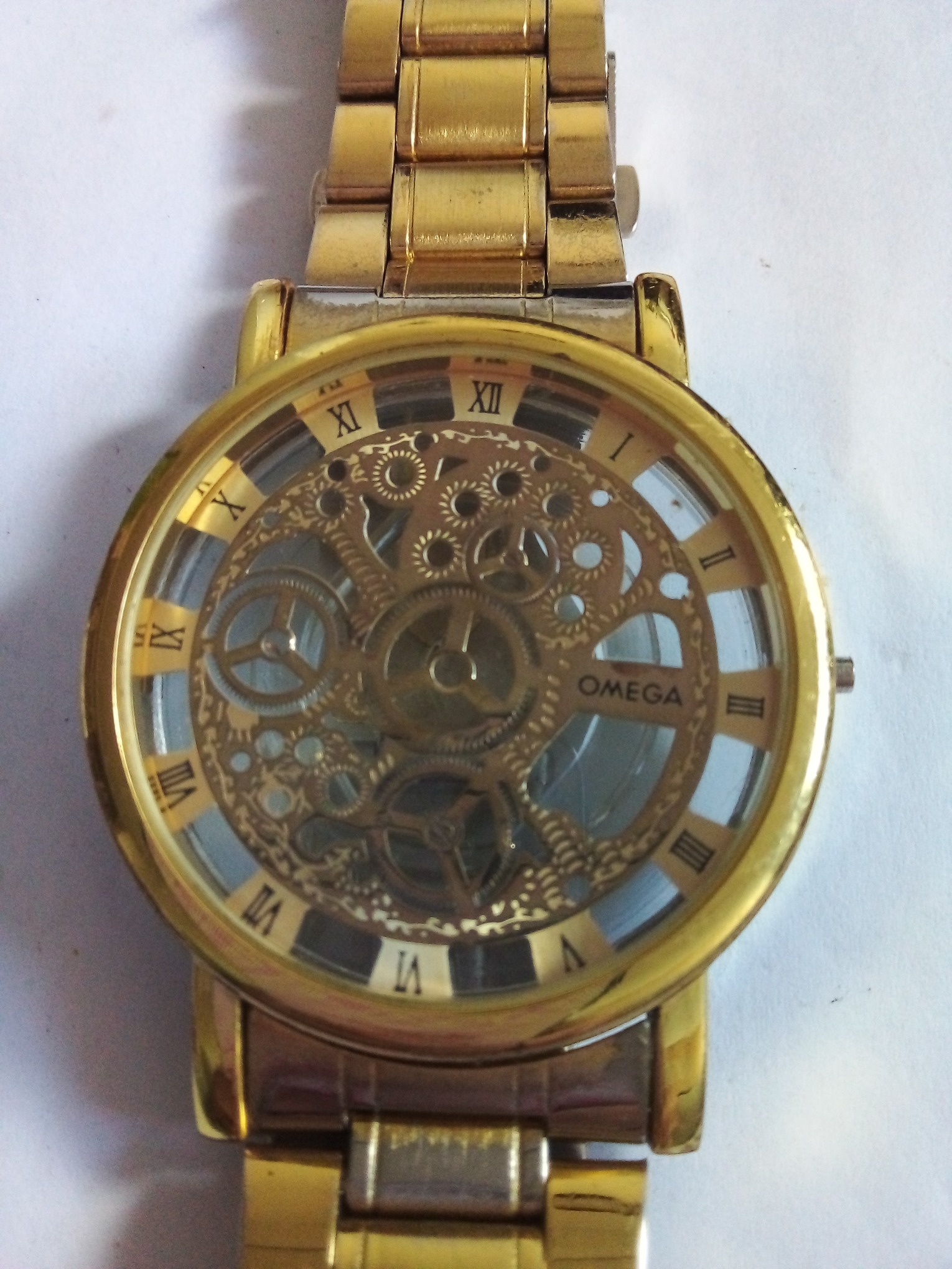 درود وروز بخیر خدمت عزیزان کاربر و سایت محترم ایسام . قاب بدنه کامل ساعت مچی مردانه بابندوقفل بند کامل وسالم با صفحه نمایش که اعداد لاتین وصفحه ساعت طلایی رنگ وامگاست . درب پشت ساعت هم شیشه ایست بابند فلزی وطلایی رنگ وصفحه گرد طلایی دقیقا طبق تصاویر .