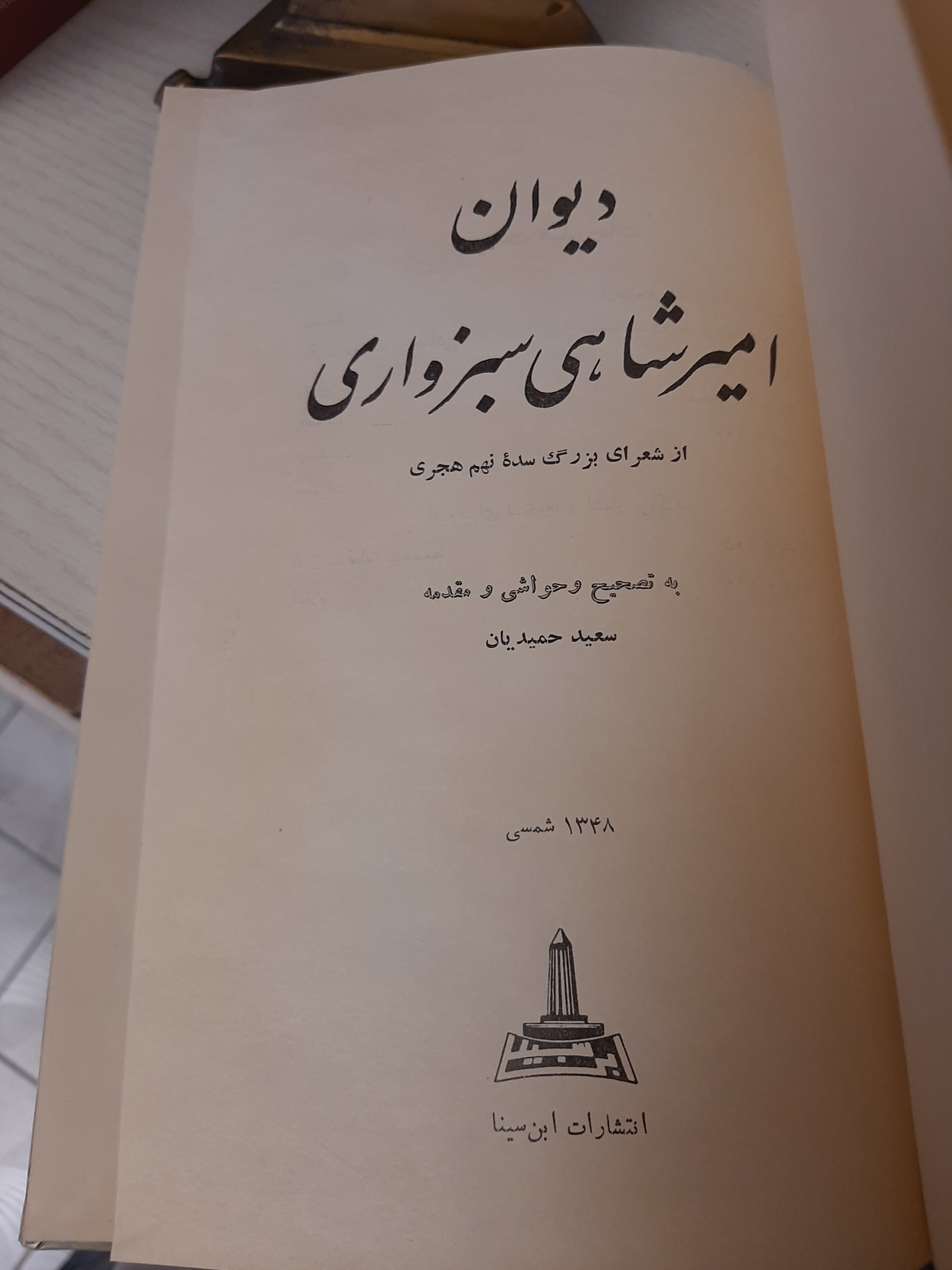 دیوان امیرشاهی سبزواری، تصحیح سعید حمیدیان، نخستین چاپ انتشارات ابن سینا سال هزار و سیصد و چهل و هشت، قطع وزیری، جلد سلفون، کاغذ روغنی سفید، صد و ده برگ، چاپ سربی، زبان فارسی و کیفیت آکبند است.