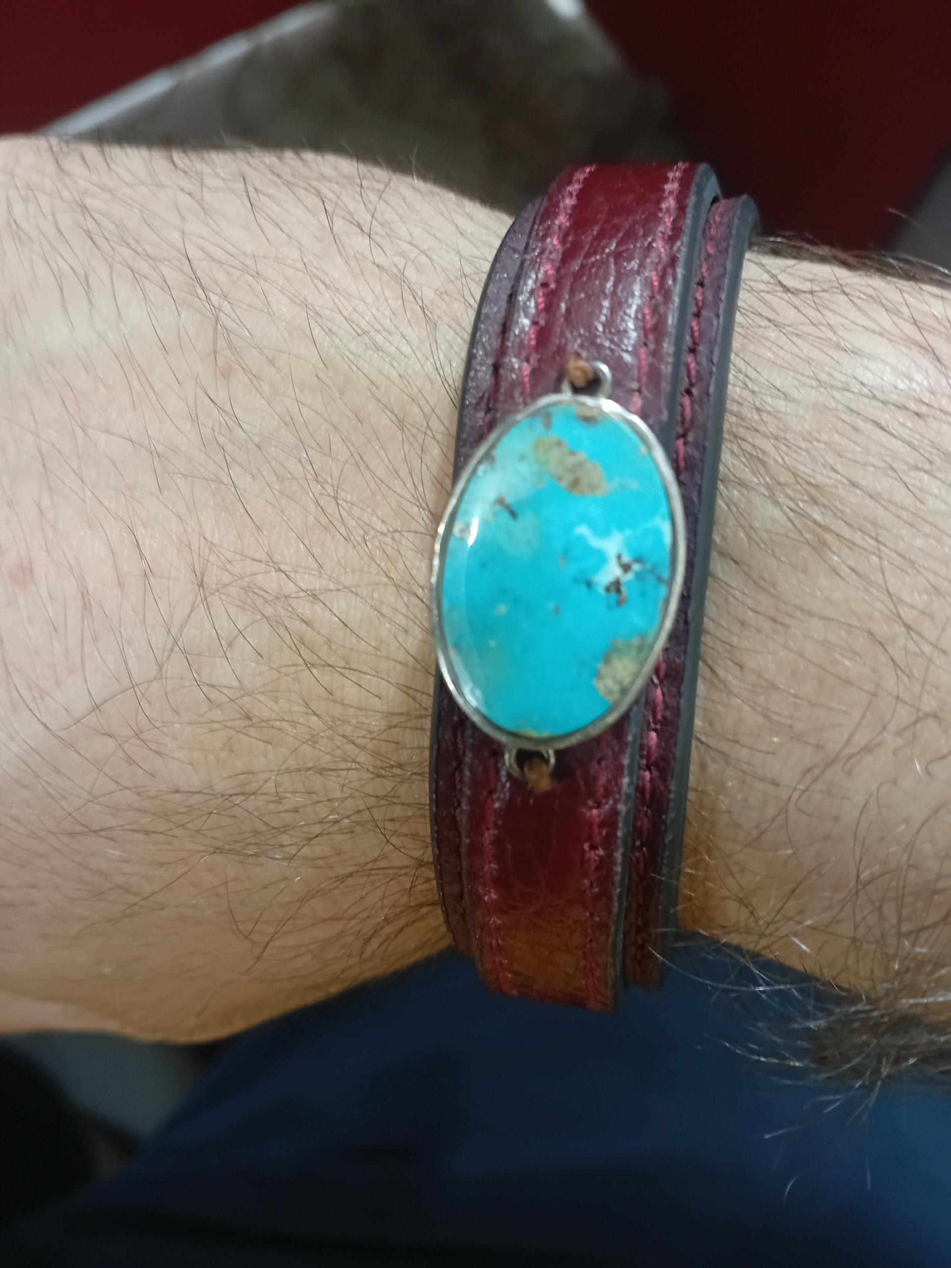 دستبند چرمی با نگین فیروزه نیشابور خوشرنگ و قاب نقره