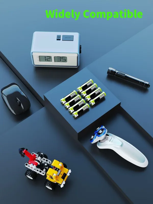 باتریهای لیتیوم-یونی قابل شارژ AA با طول عمر بالا 1.5 ولت 3000 میلی وات ساعت، بسته 8 تایی، دارای شارژر داخلی، ضد نشت، شارژ مستقل، شارژ سریع با محافظ برق