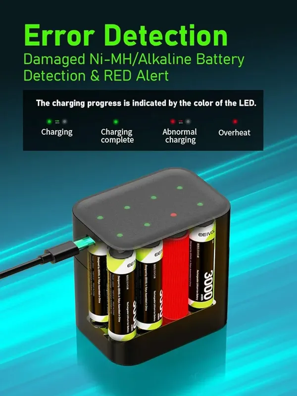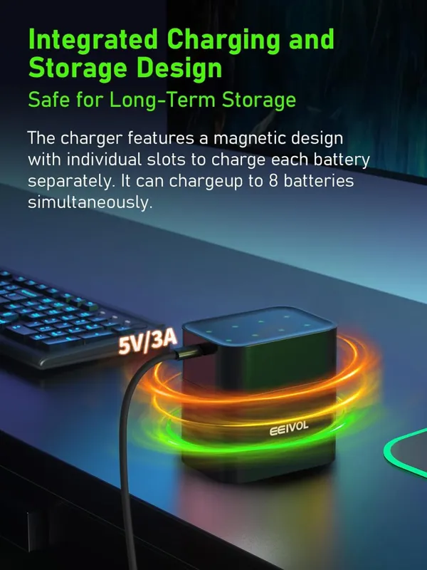 طراحی قابل حمل و همه کاره برای شارژ و ذخیره سازی شارژر باتری لیتیومی EEIVOL دارای طراحی مغناطیسی با 8 شیار شارژ مستقل است که شارژ و ذخیرهسازی را برای راحتی بیشتر ترکیب میکند. از شارژ انعطاف پذیر برای 1 تا 8 باتری لیتیومی AA برای رفع نیازهای مختلف پشتیبانی میکند.