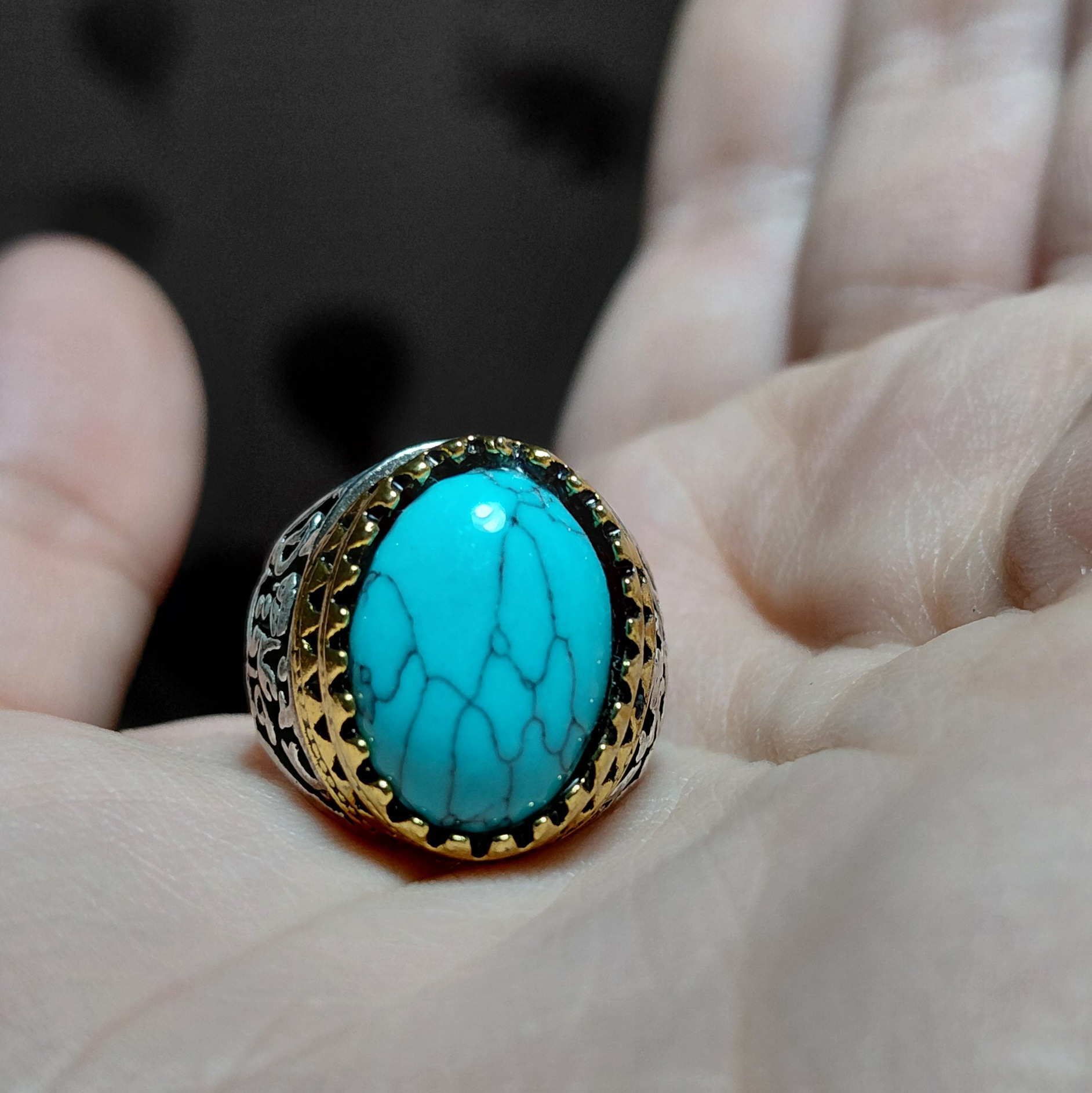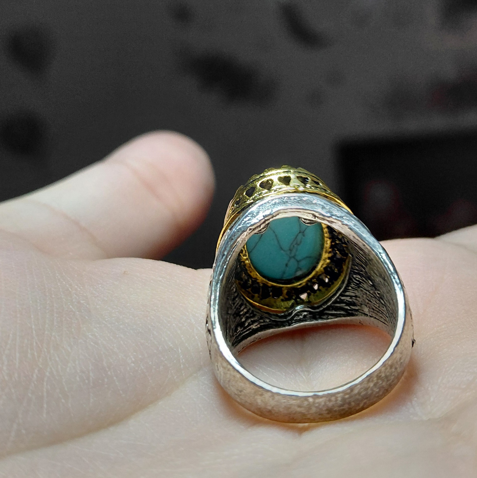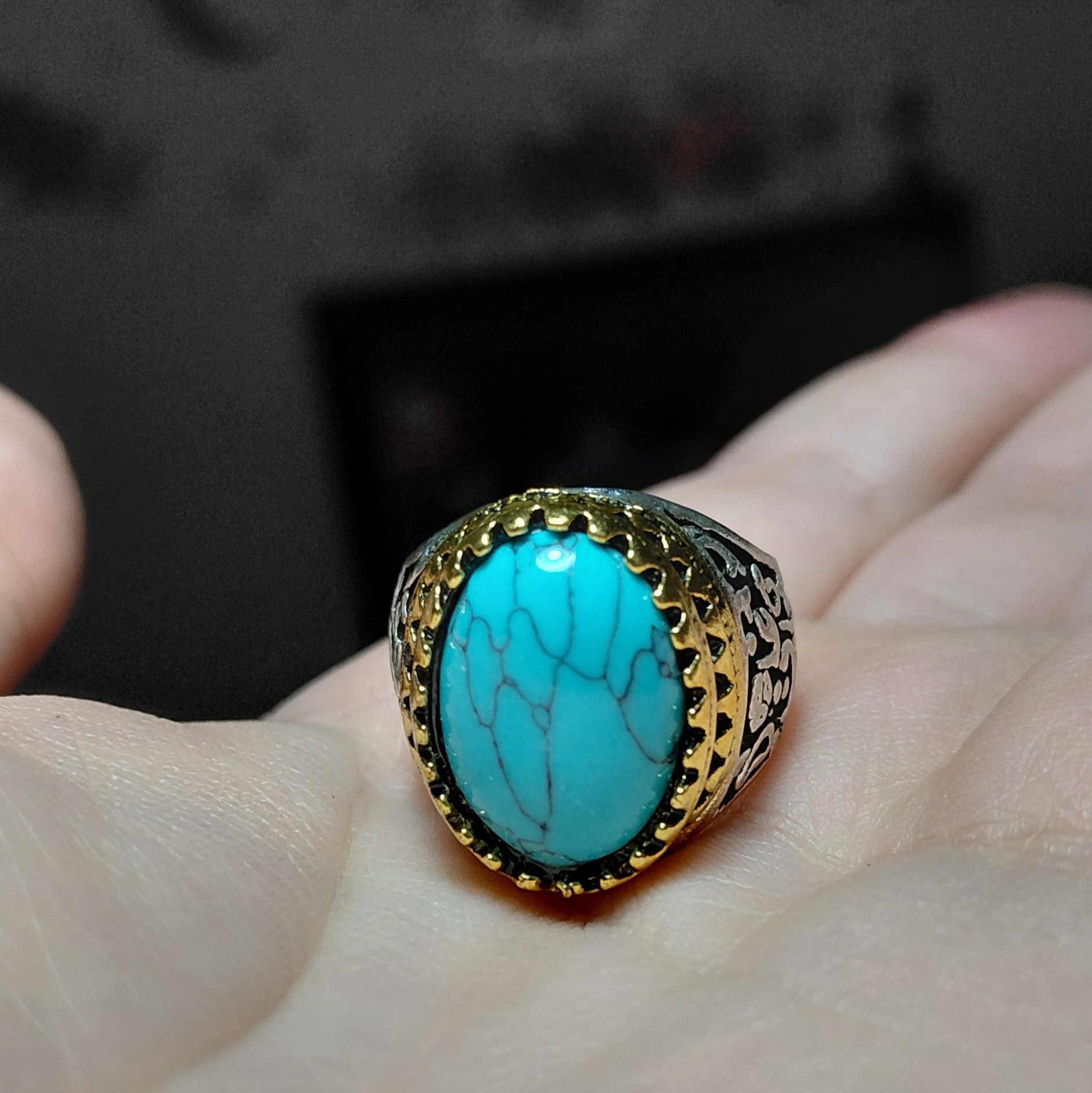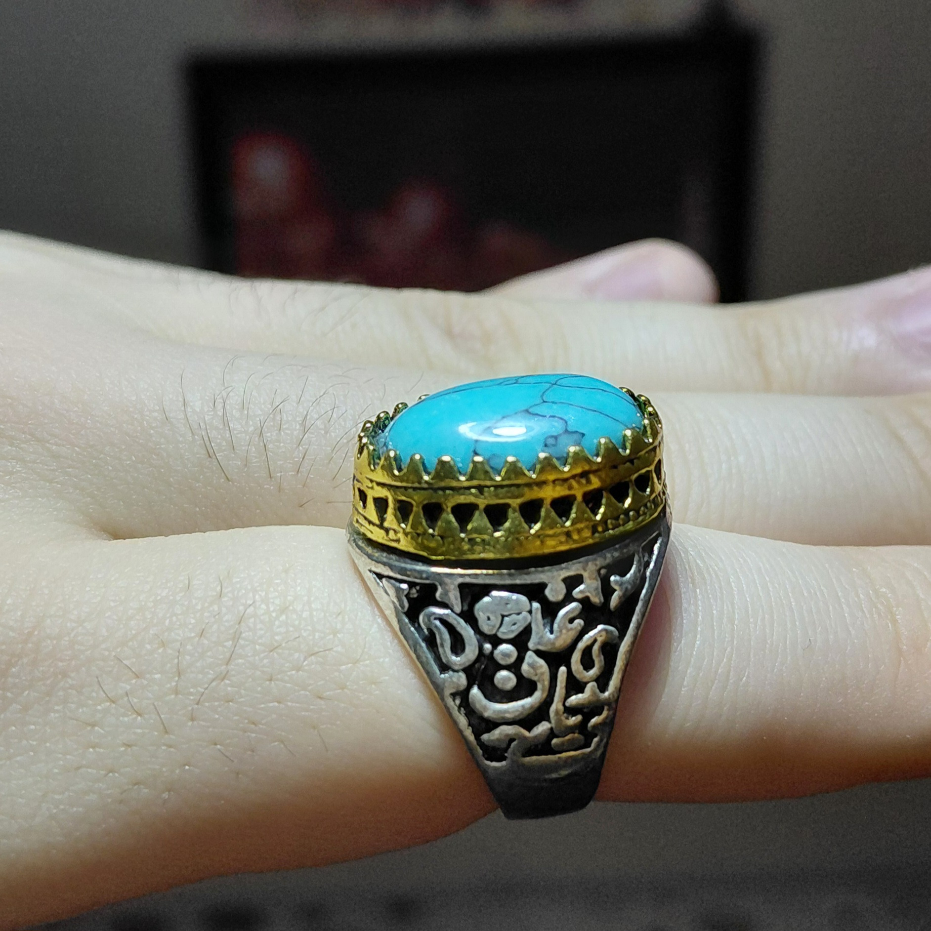انگشتر با نگین فیروزه وبا رکاب طرح قلم زنی