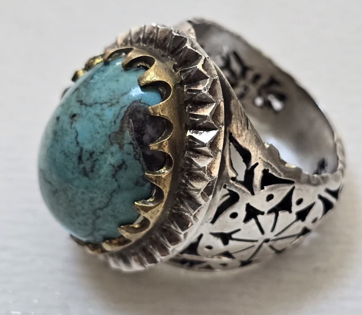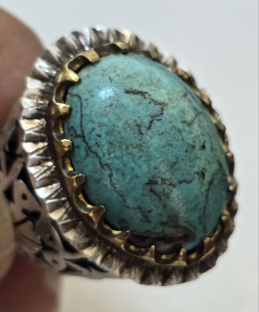 انگشتر دستساز نقره فیروزه نیشابور رنگ عالی زیبا مغز سنگ با رکاب سر برنجی