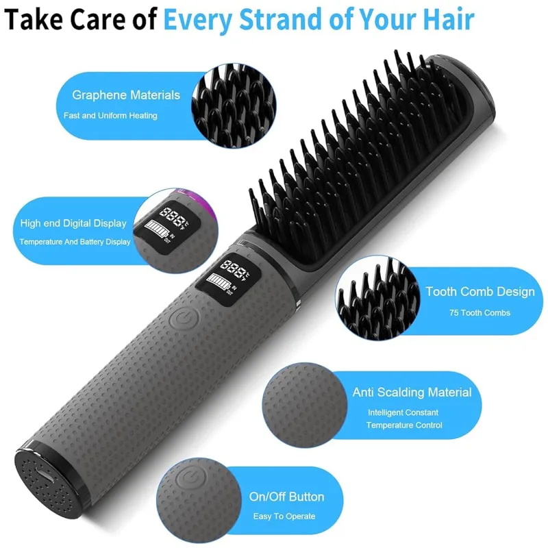 برس صاف کننده مو بیسیم، شانه صاف کننده قابل حمل برای سفر/خانه/فضای باز، شانه حالت دهنده مو با یون منفی، شانه حالت دهنده مو زنانه، شارژ USB 5000 میلی آمپر ساعت، ضد سوختگی