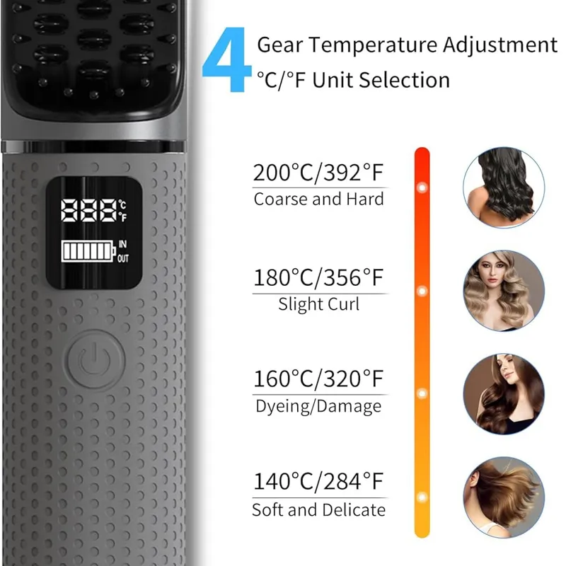 طراحی بیسیم قابل حمل، قابل حمل و نقل این برس صافکننده موی بیسیم تنها 230 گرم وزن دارد، استفاده و حمل آن آسان است و شما را در هر کجا که هستید در شرایط مطلوب نگه میدارد. نگران پیدا کردن پریز برق یا سیمهای گره خورده نباشید. طراحی جمع و جور و سبک آن برای سفر عالی است و میتوانید آن را در هر چمدانی قرار دهید.