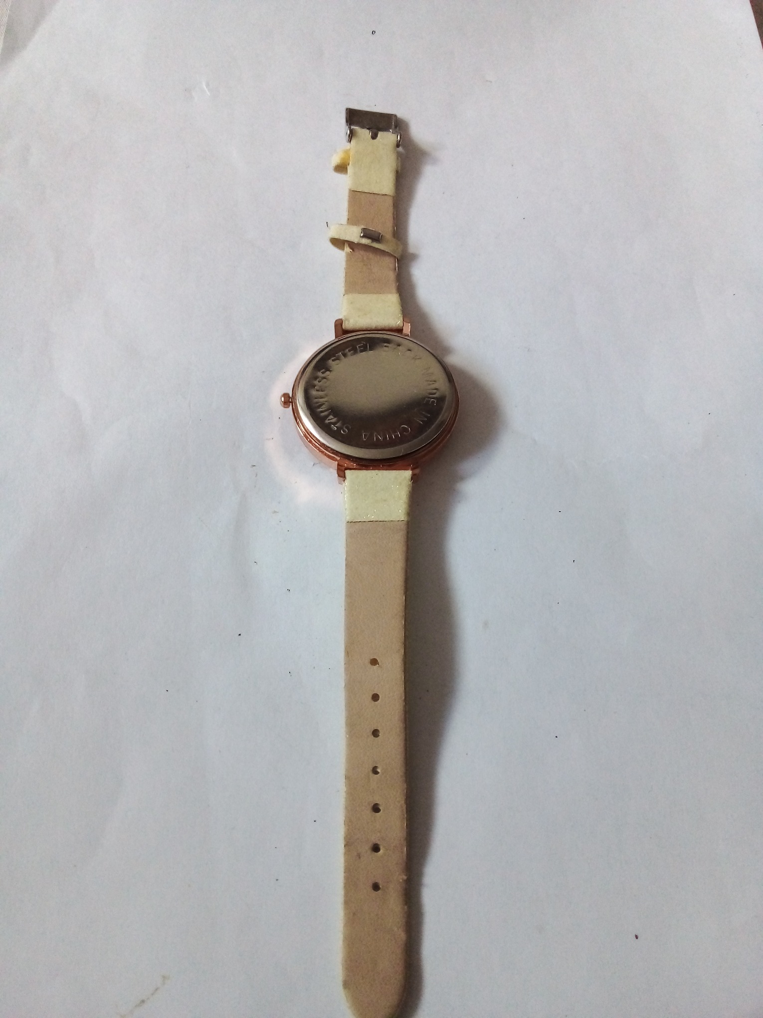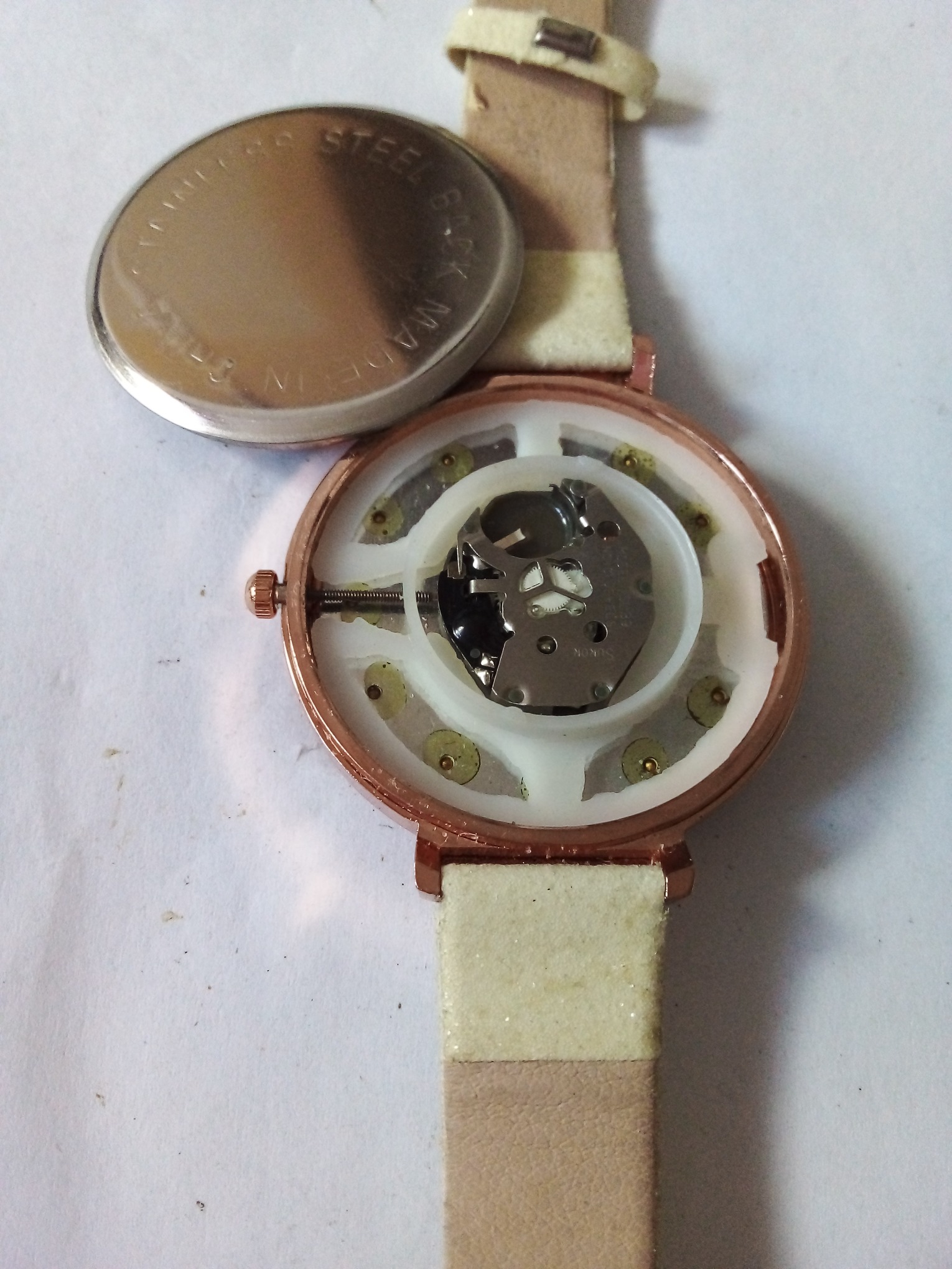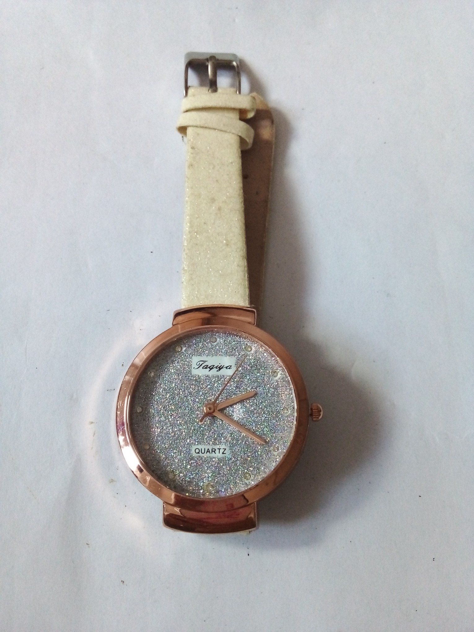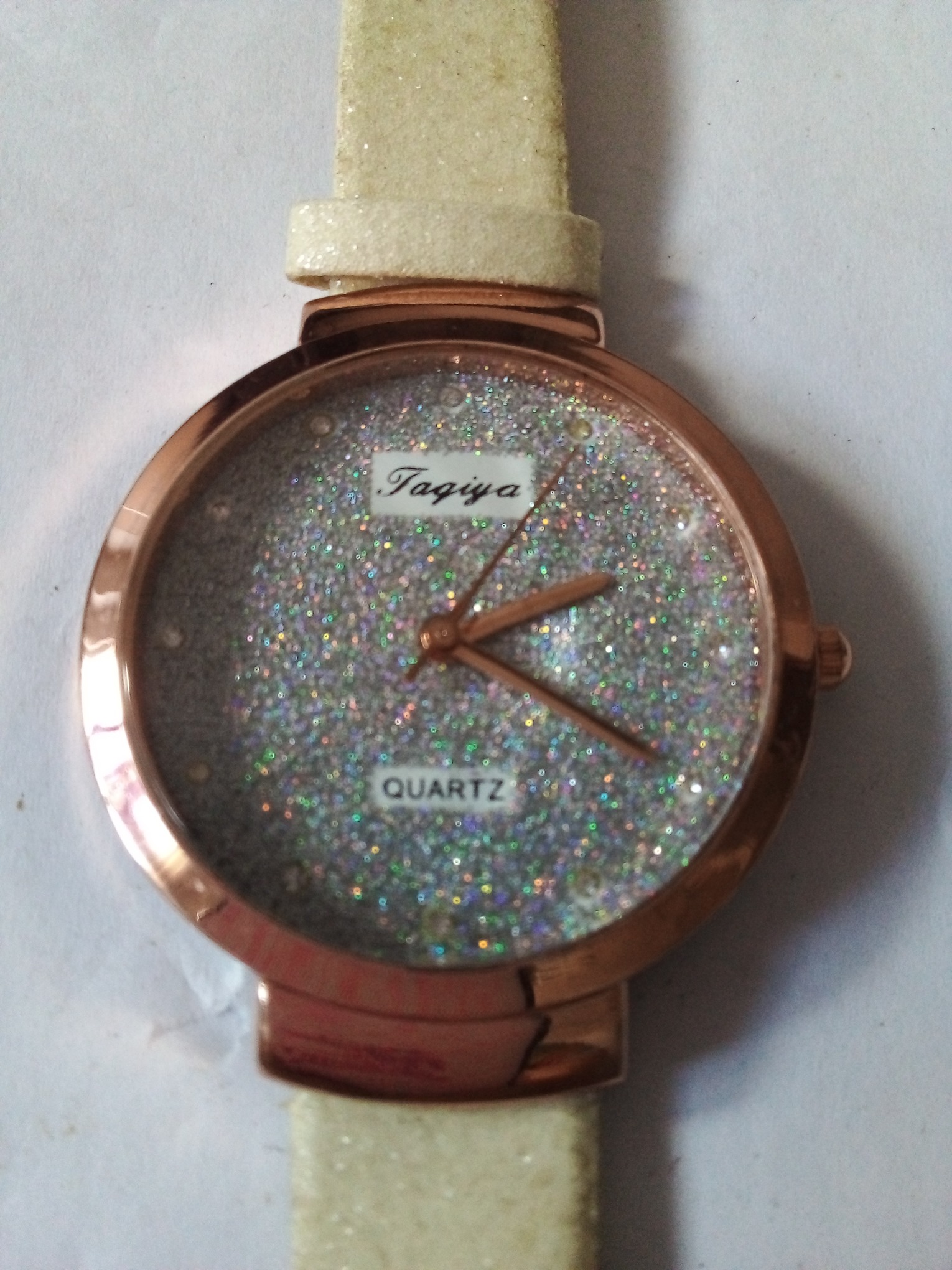 درود وروز بخیر خدمت عزیزان کاربر و سایت محترم ایسام . ساعت مچی دخترانه با قاب بدنه مسی رنگ وکامل وسالم با صفحه نمایش نقره ای رنگ وعقربه وموتور . بند ساعت کرم رنگ واکلیلی با سگک وپل بند دقیقا طبق تصاویر . عزیزان خریدار قبل از اقدام به خرید لطفا وحتمن