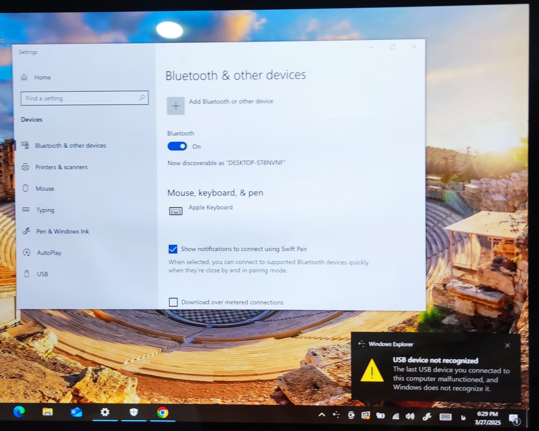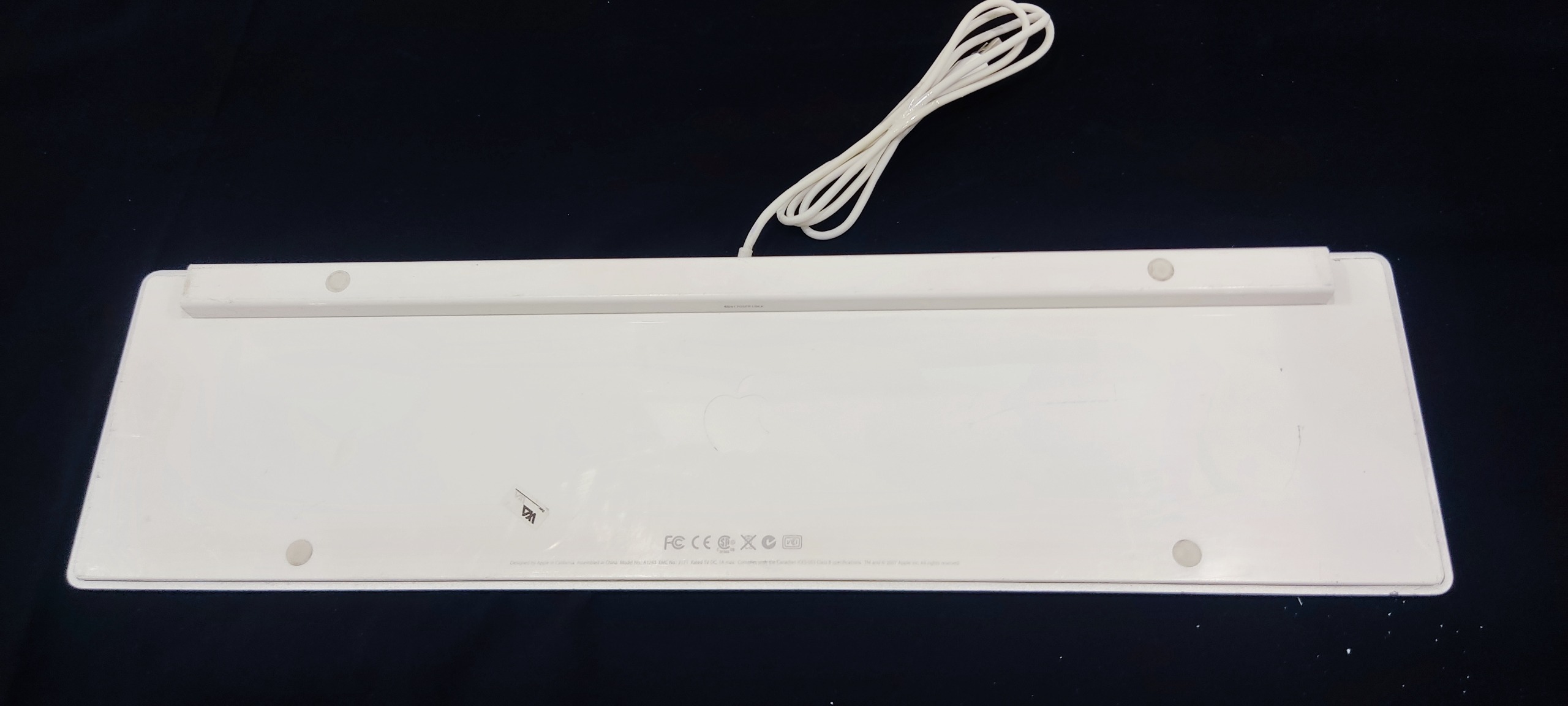 کیبورد از نظر ظاهری کاملا سالم هست، زمانی که به سیستم متصل میشود، Apple keyboard را شناسایی میکند (طبق عکس) ولی پیغام Usb device not recognized را نشان میدهد.(طبق عکس)