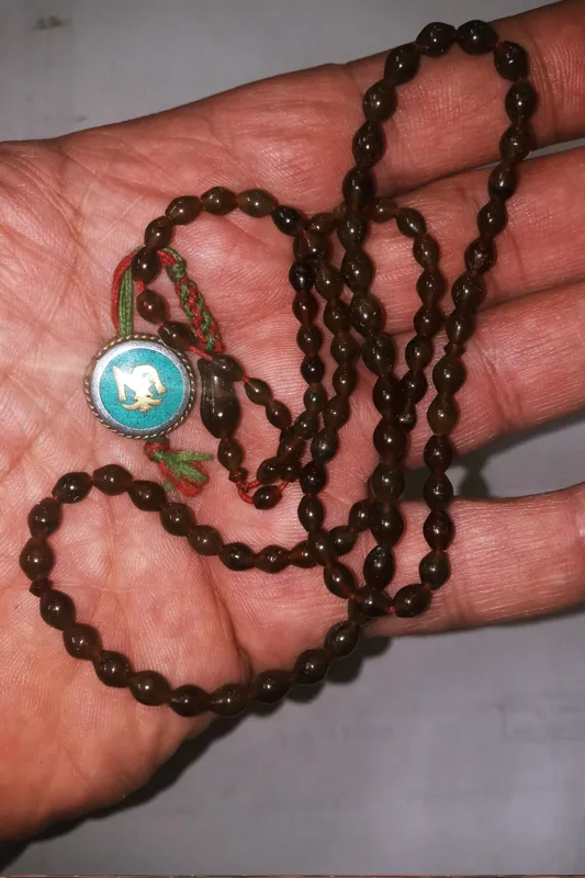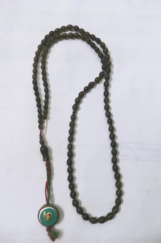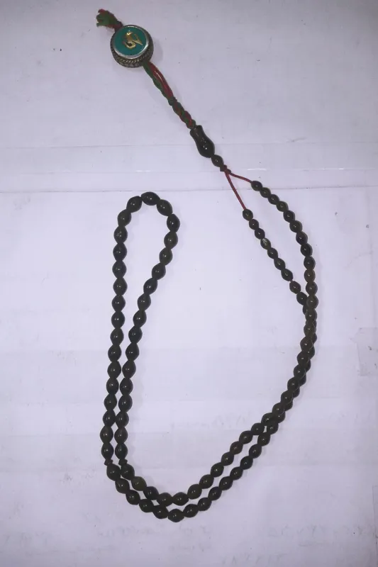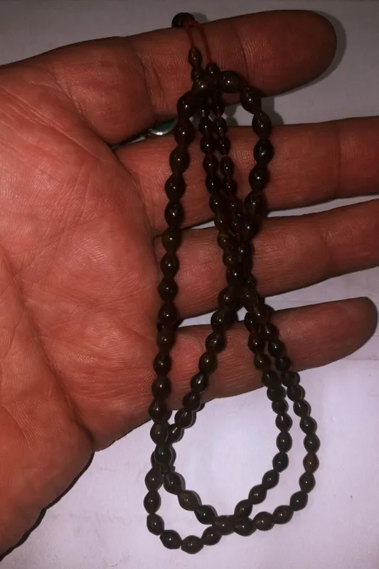 تسبیح شاه مقصود 101 تایی دونه ریز به طول 30 سانت دونه ها دودی رنگ در نور زرد با خالهای زغالی دیده میشود واقعا یک کار استثنایی و بی نظیر .بالای شیخک سر تسبیحی برنجی مزین به نام خدا به زبان هندی دارد.
