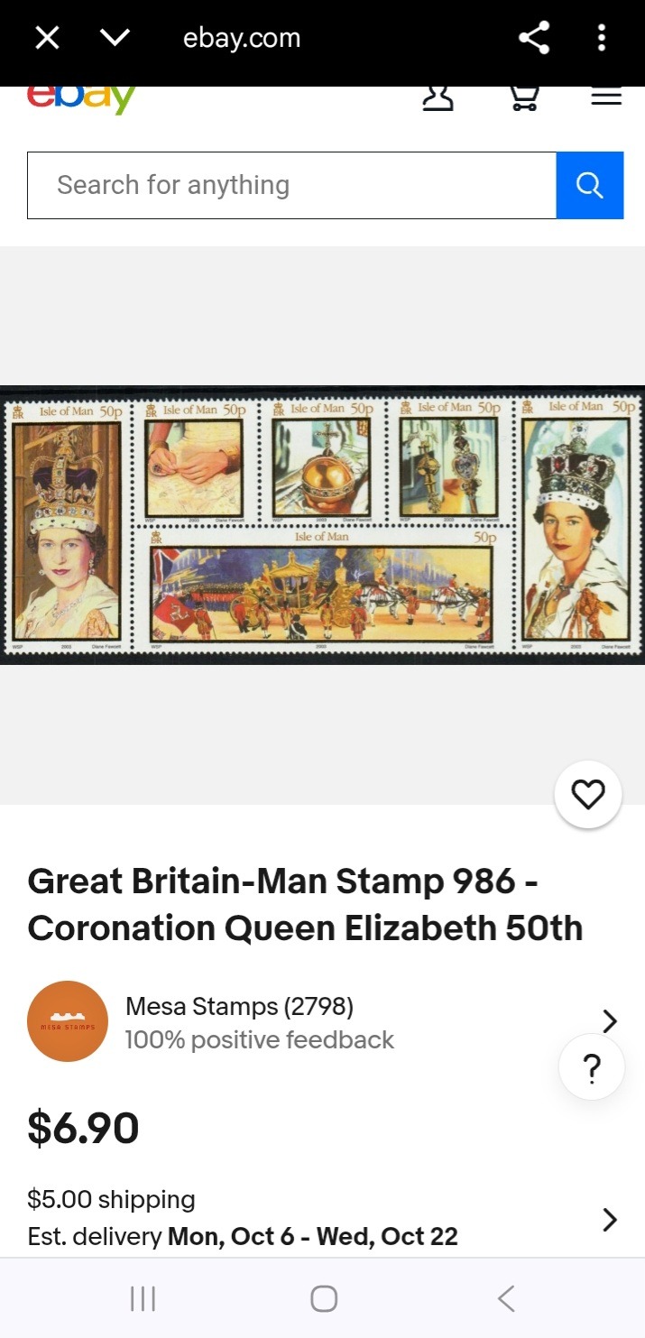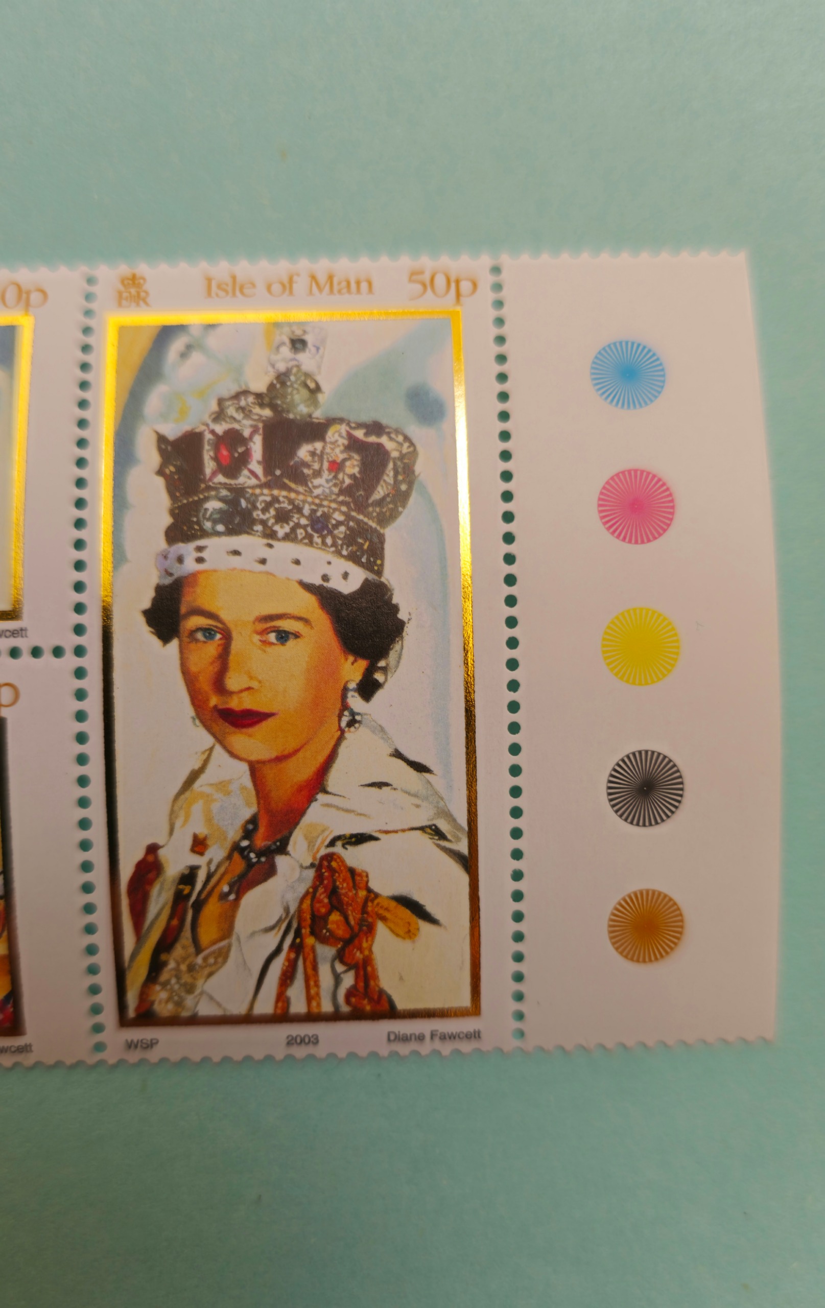 یک سال پس از جشن طلایی، در 2003، جزیره من به افتخار این مناسبت مجموعه ای نفیس منتشر کرد: شش تمبر متصل به هم با ارزش اسمی 50 پنی. این تمبرها با تصاویری از جواهرات سلطنتی و نمادهای تاج گذاری، روایتی هنری و ماندگار از شکوه سلطنت را به تصویر می کشند.