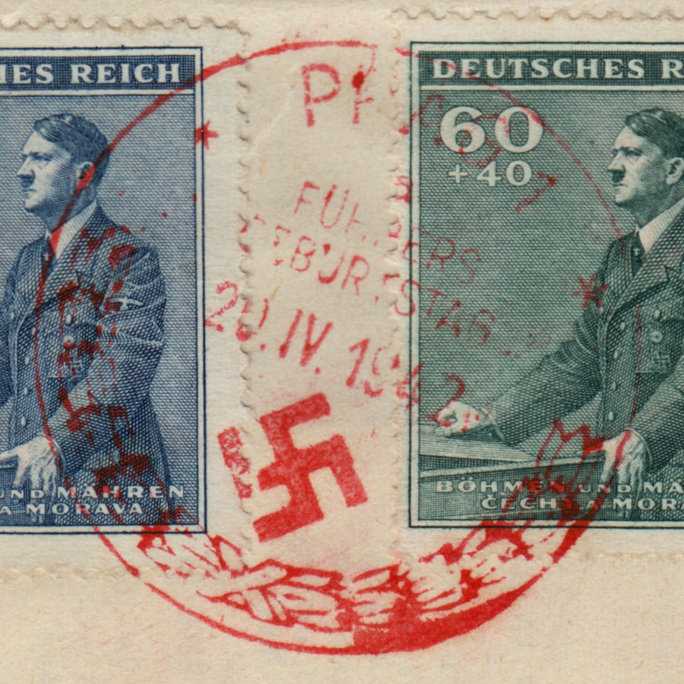 مهر پستی: یک مهر پستی قرمز رنگ و دایرهای شکل، تاریخ "20.4.1942" را نشان میدهد. روی مهر عبارت "Führers Geburtstag" (تولد پیشوا) نیز نوشته شده است. این مهر به صورت ویژه برای تولد آدولف هیتلر (20 آوریل) در شهر پراگ (Prag) استفاده شده است و یک نمونه بارز از