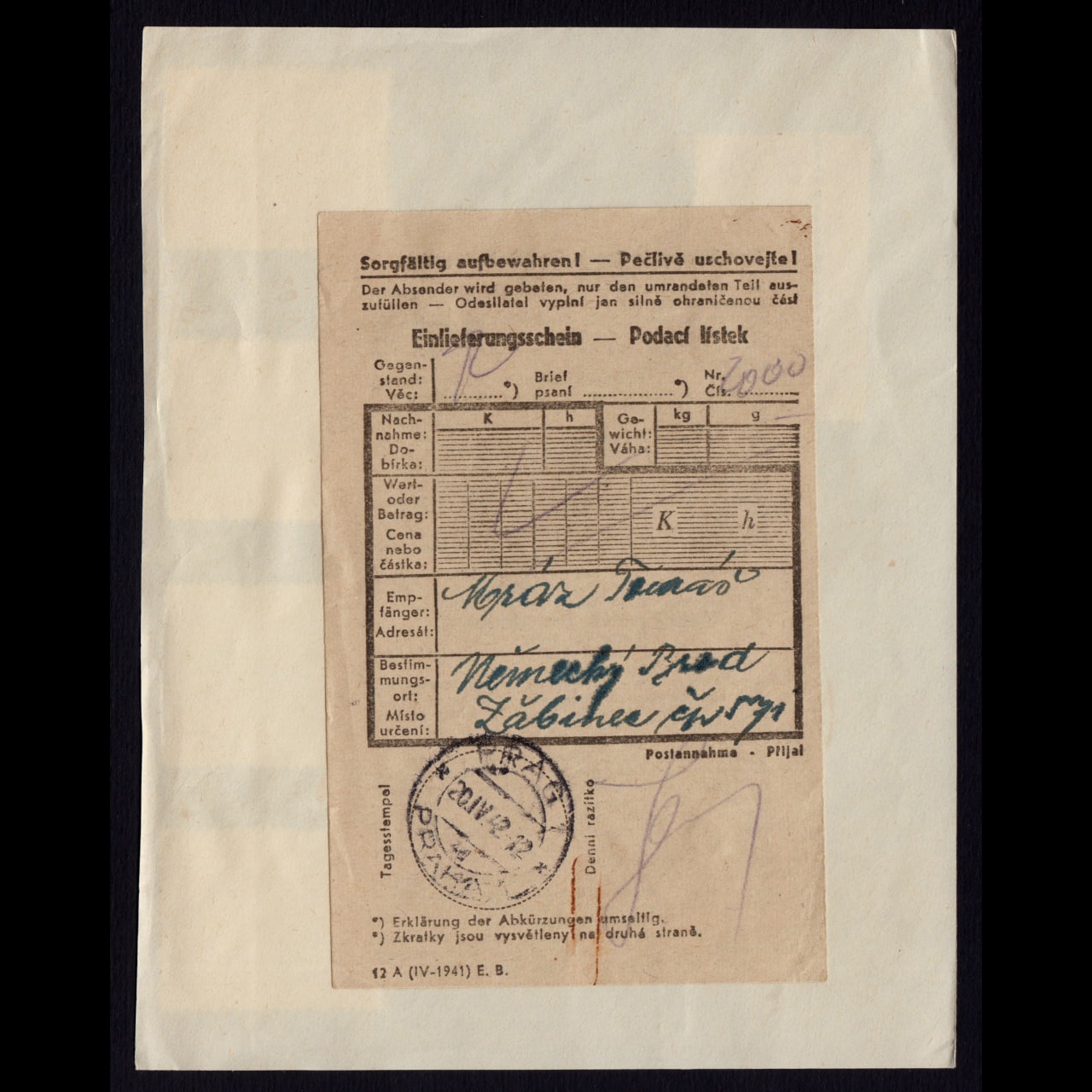 پشت پاکت یک فرم چاپی مخصوص پست سفارشی را نشان میدهد که هم به زبان آلمانی و هم به زبان چکی نوشته شده است. این مورد به اشغال منطقه توسط آلمان و وجود هر دو زبان در آن زمان اشاره دارد