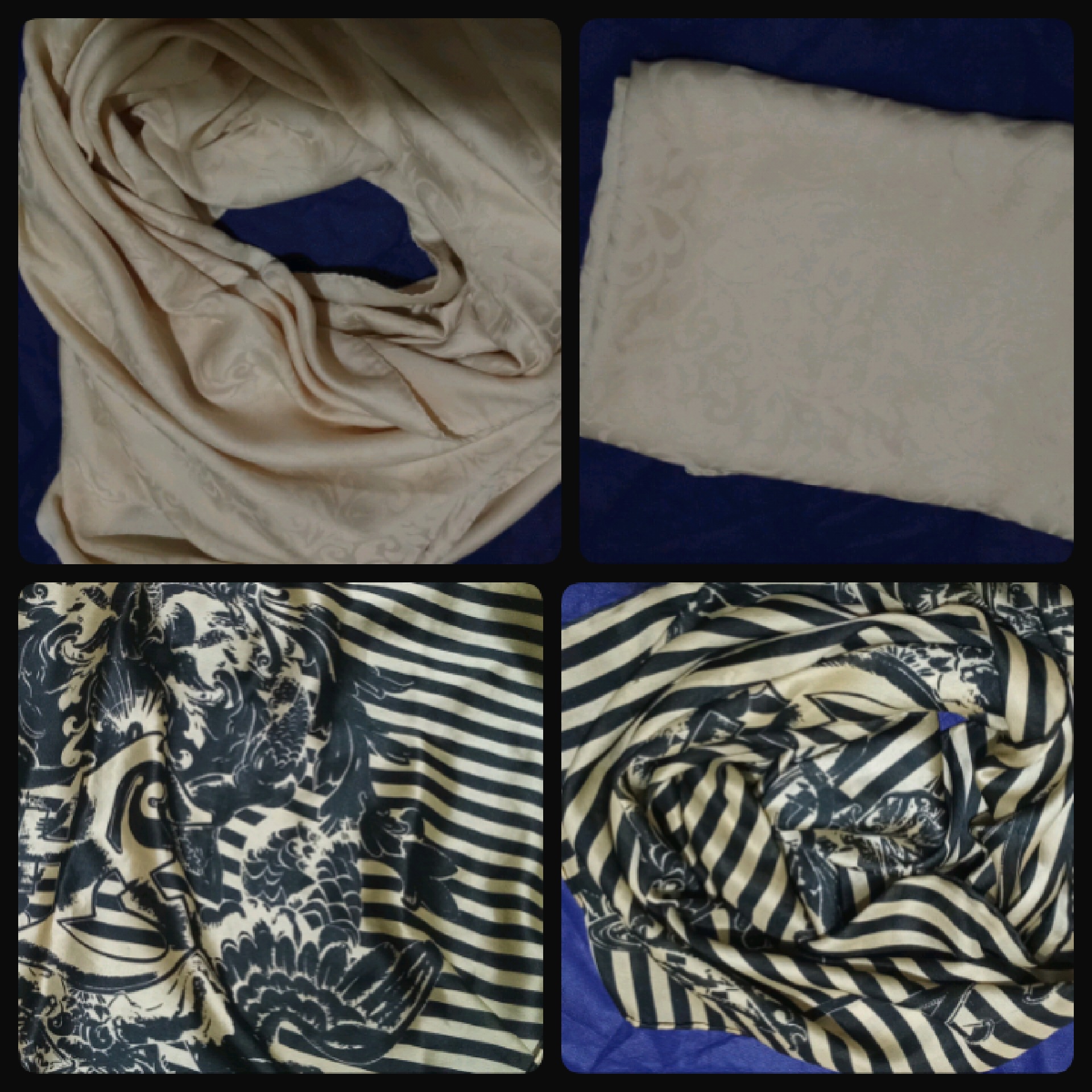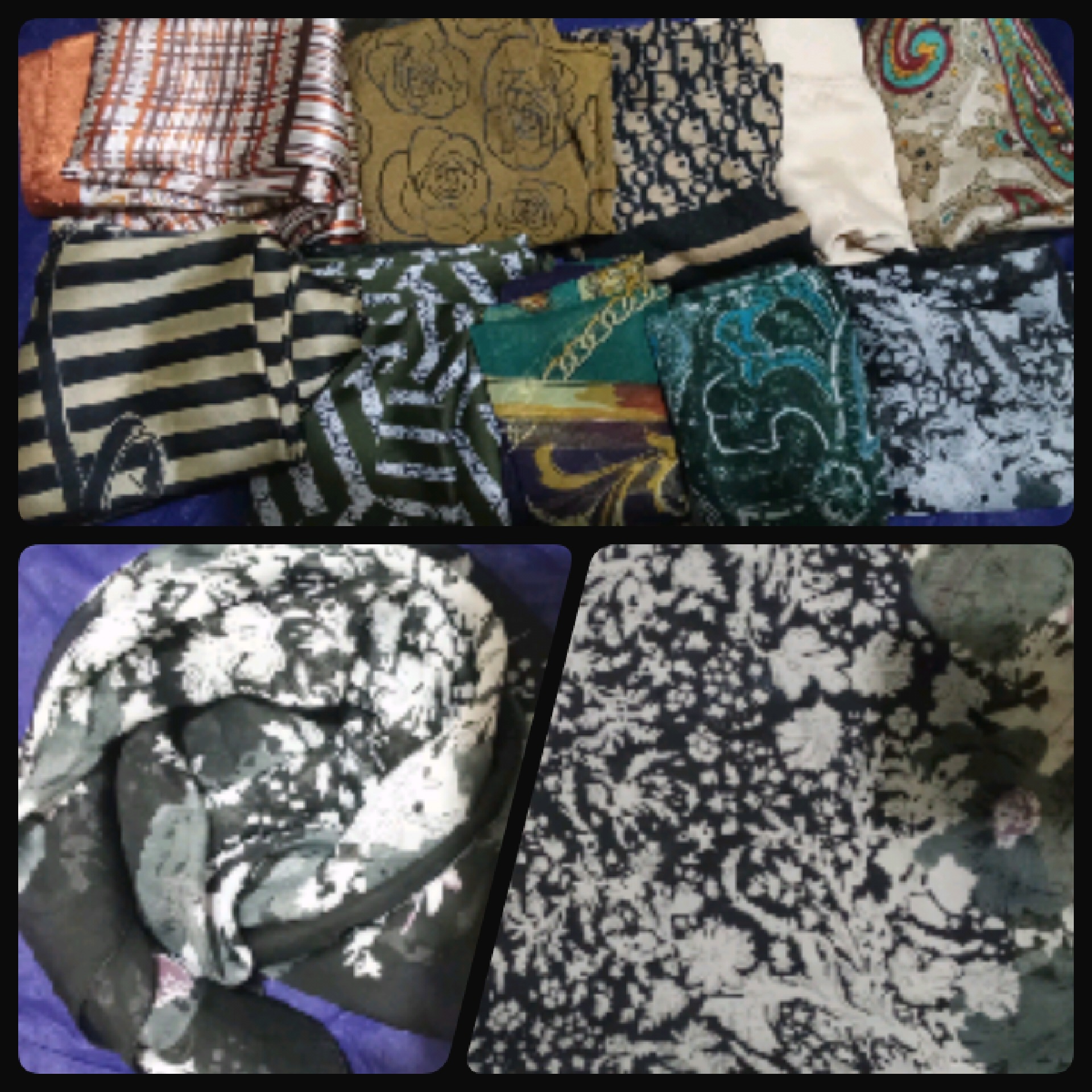 تعداد 10 روسری نو که بیشترشون قواره دار هستن و بعضیاشون جنس ساتن، همگی جنس خوب و درجه یک قیمت همه با هم 500 هزار تومان