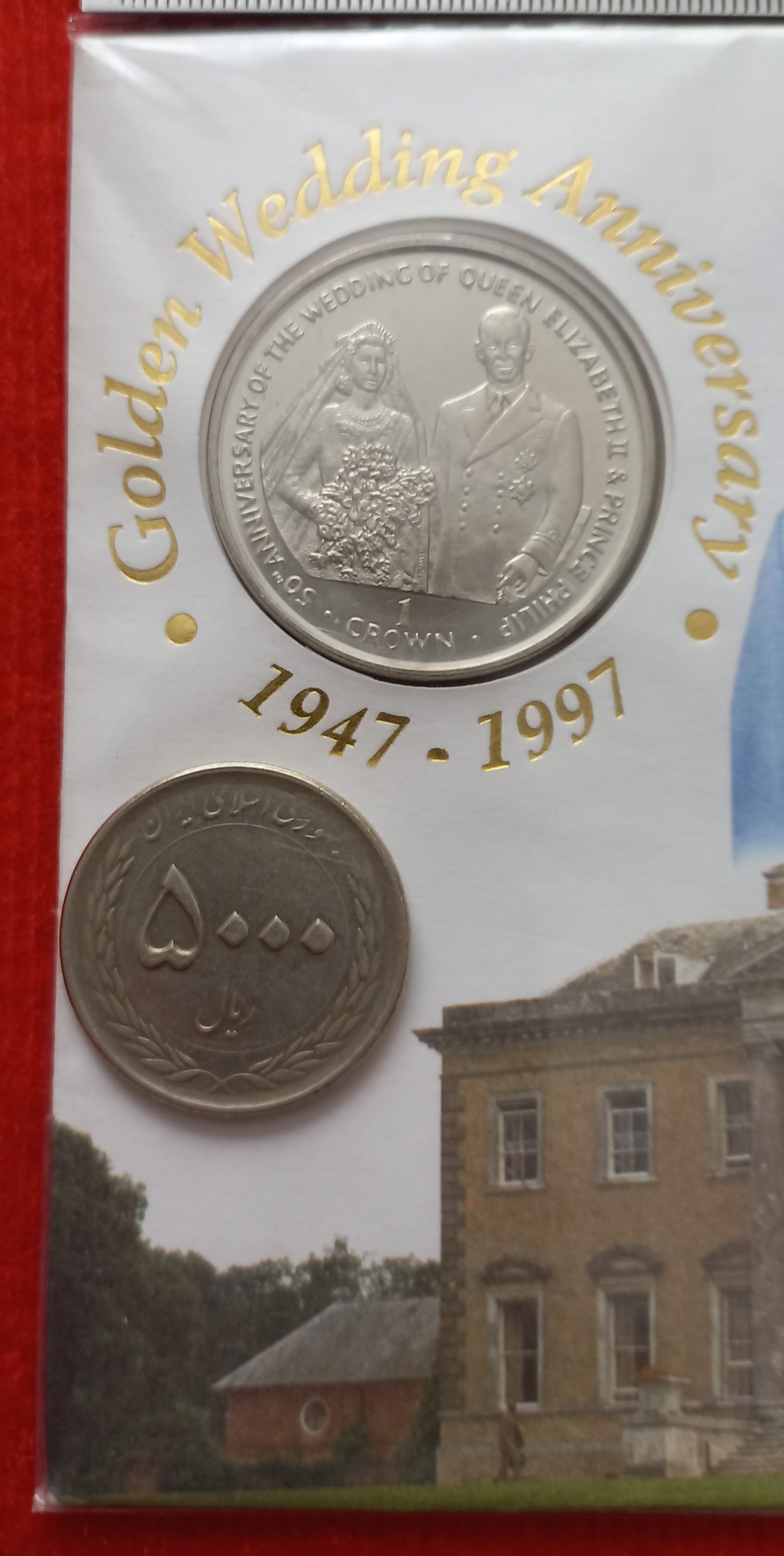آیتم 16 - 679 _ پاکت مهر روز و سکه سایز بزرگ 1 کران (5 شیلینگ) 1997 جزیره مان ، بمناسبت پنجاهمین سال ازدواج ملکه الیزابت دوم و پرنس فیلیپ .