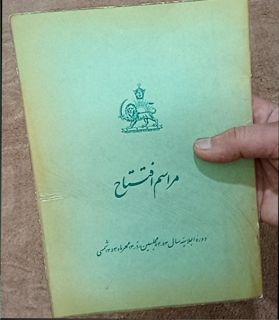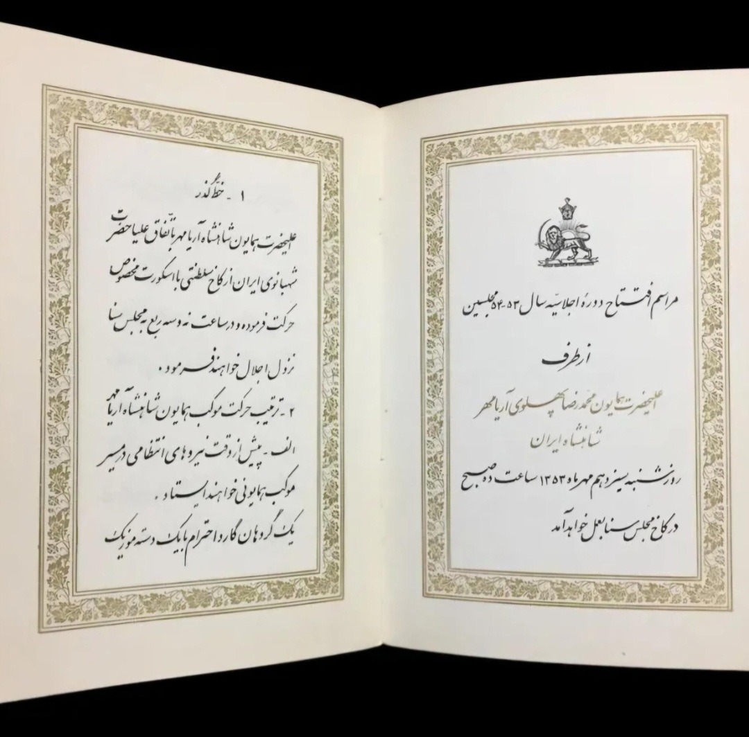 کتاب اهدایی افتتاح مجلسین سنا و شورای ملی سال 1353،چاپ مجلس،قطع وزیری،کیفیت خیلی خوب،کامل،کاملا سالم و تمیز، 8 ص،در انتهای کتاب دو برگ بزرگ تاشو از نقشه تالار بزرگ مجلس وجود دارد.این کتابچه ها فقط به نمایندگان مجلس و میهمانان ویژه مراسم افتتاح مجلس اهدا میشده و بسیار کمیاب میباشد