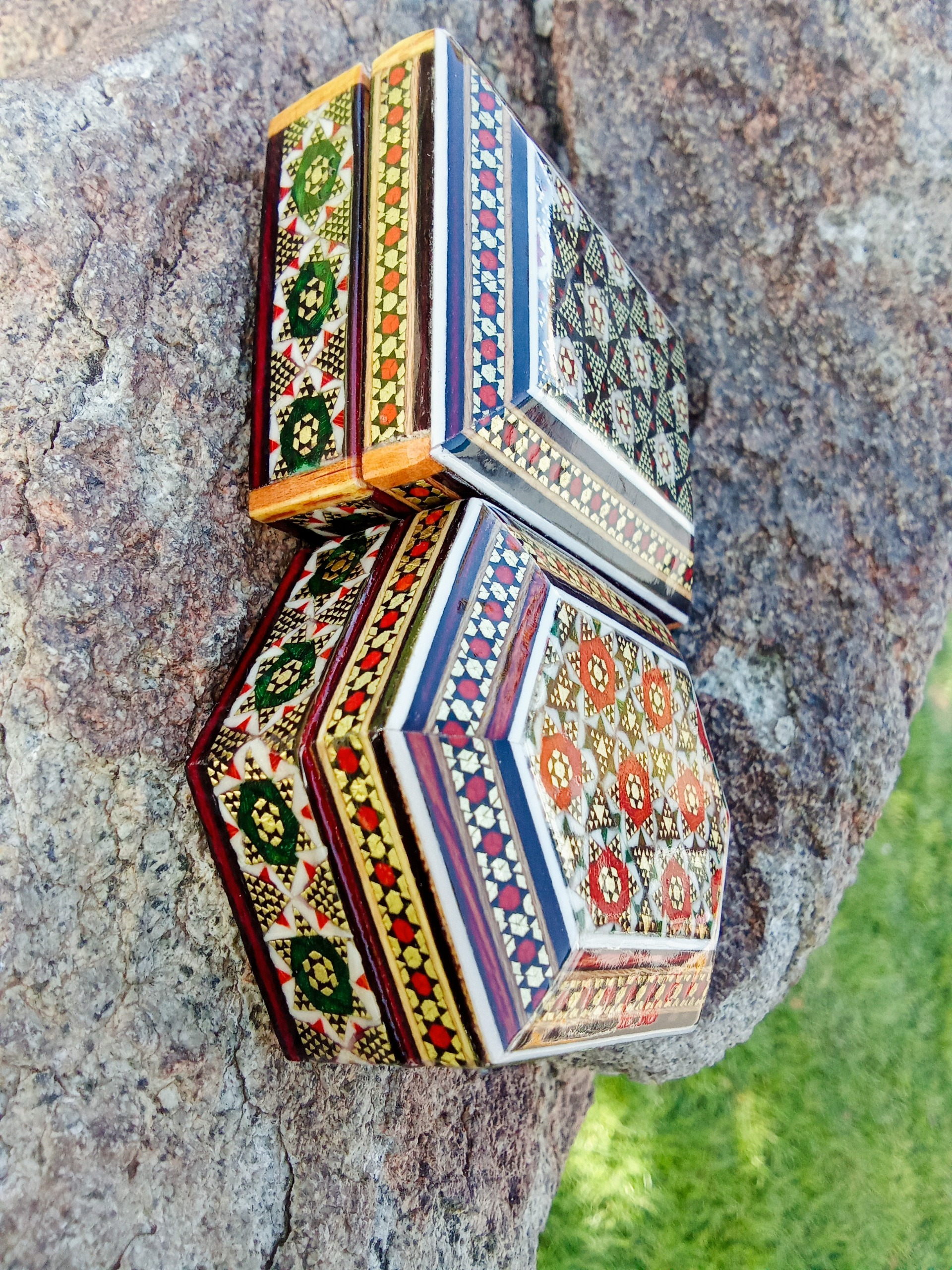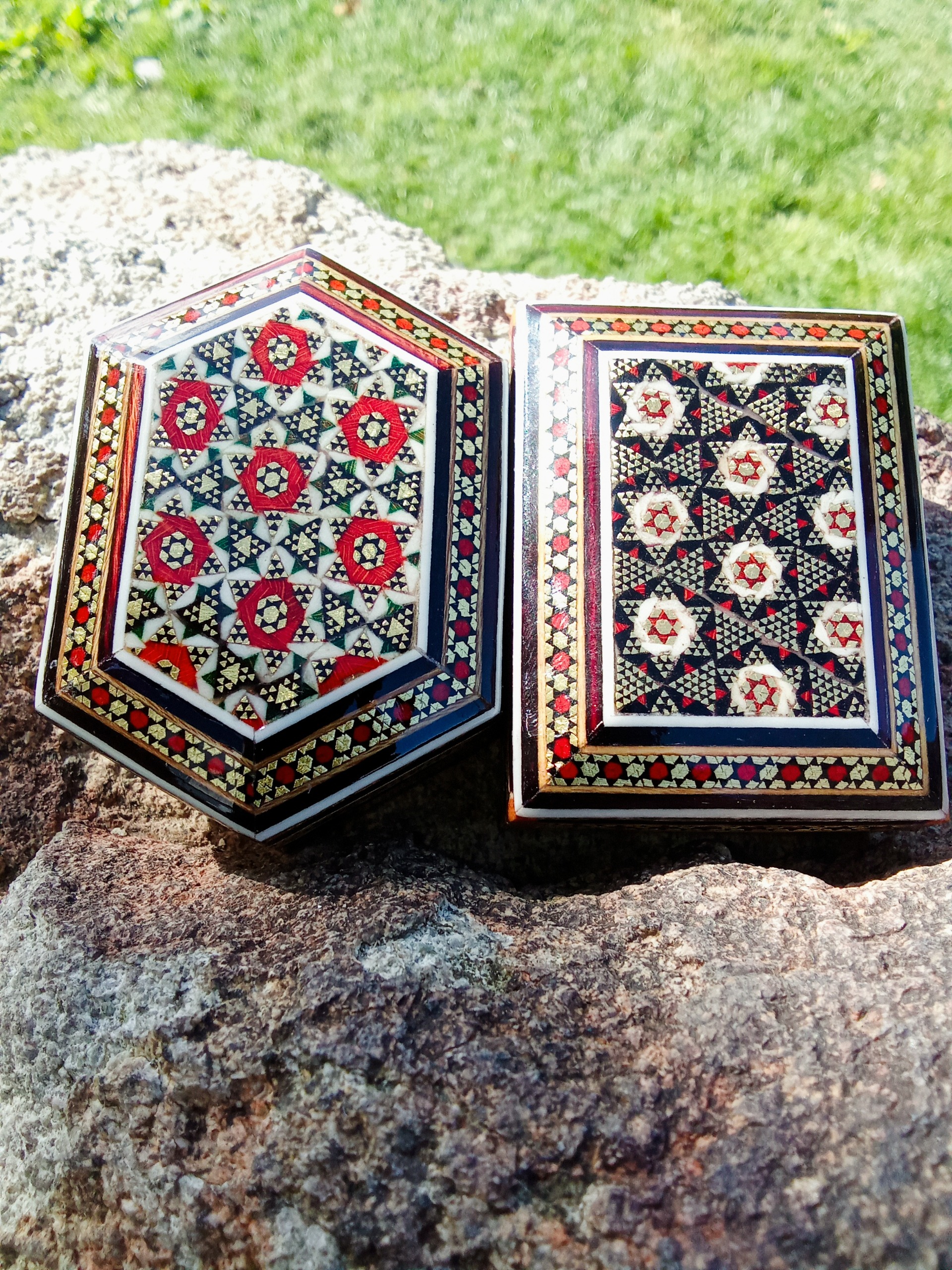 جعبه جواهر خاتم کاری شده کار اصفهان دوطرح زیبا وانتیک کاردست سایز10×15قیمت 270 تومان وسایز بزرگتر15×25قیمت 400تچمان