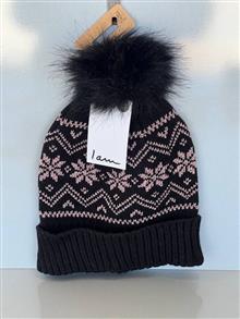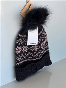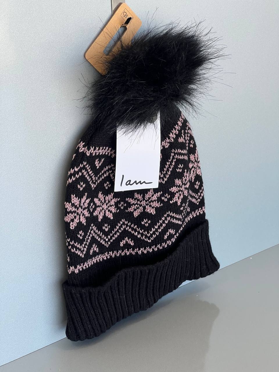 پومدار: پوم بزرگ و مشکی رنگ از جنس خز مصنوعی، در بالای کلاه قرار گرفته و به آن جلوهای شیک و playful میدهد. این پوم بسیار نرم و پرپشت است.