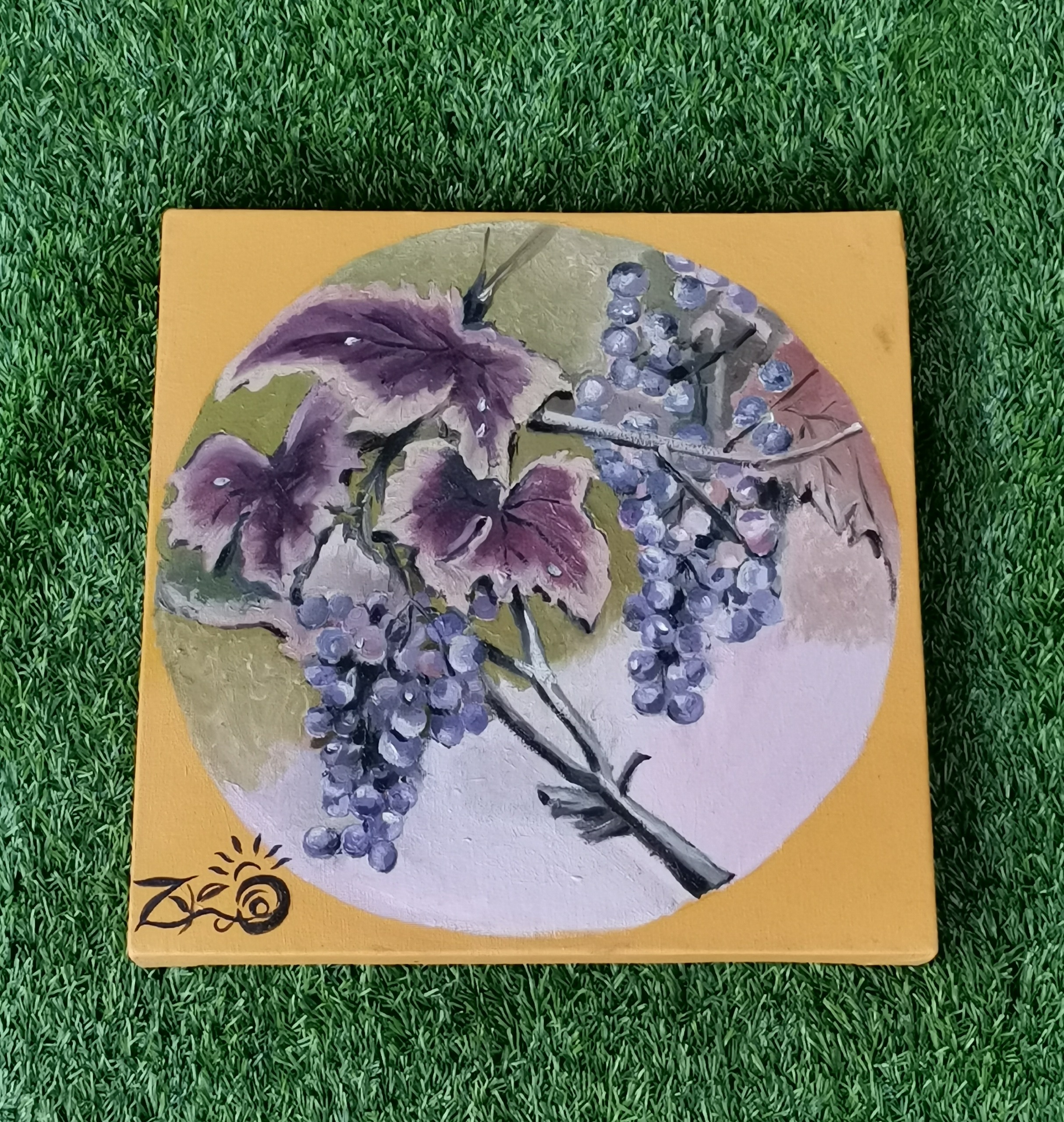 پسزمینهی زرد درخشان: رنگ زرد قوی پیرامون دایره، نماد انرژی، حیات و خورشید است. انگار که این نعمت (انگور) انرژی خود را از گرمای حیاتبخش خورشید گرفته است.