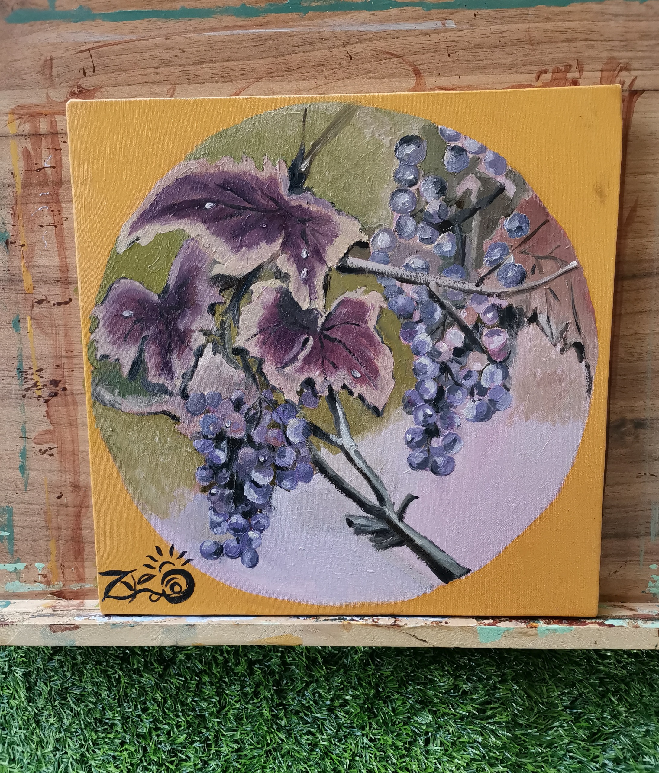 انگور و برگ: اشاره به مضمونهای کلاسیک و نمادین در تاریخ نقاشی (مانند فراوانی و چرخهی حیات) دارد.