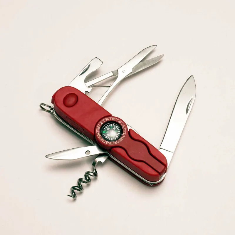 ابزار شامل: چاقو، قیچی، چوب پنبه بازکن، در بازکن بطری، کنسرو بازکن، سنبه، قطب نما، چراغ، حلقه، یک فلز براق به عنوان آینه (بر روی دسته قرار دارد)