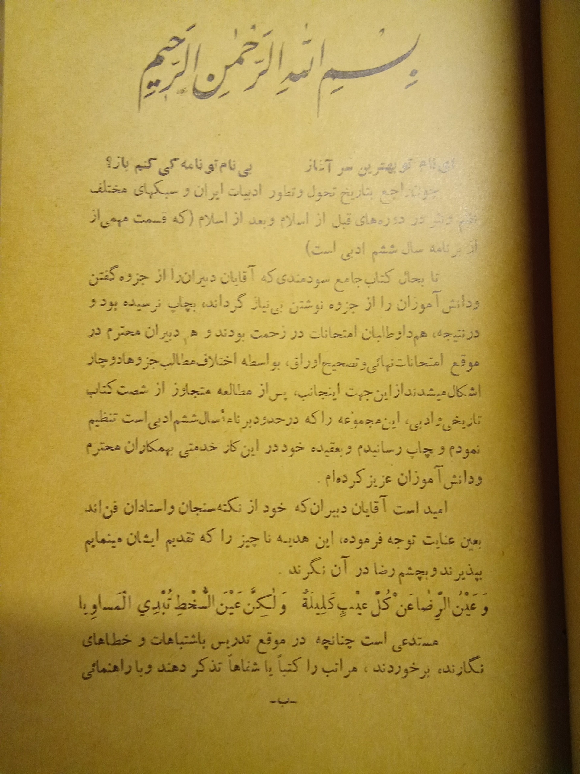 کتاب تاریخ تحول و تطور ادبیات ایران مشتمل بر زبانهای معمول قبل از اسلام و سبکهای نظم و نثر فارسی با اشاره به سیر علوم و فنون در ادوار مختلف ادبی مخصوص سال ششم ادبی دبیرستانها طبق برنامه جدید وزارت فرهنگ در سال 1333 به چاپ رسیده است .