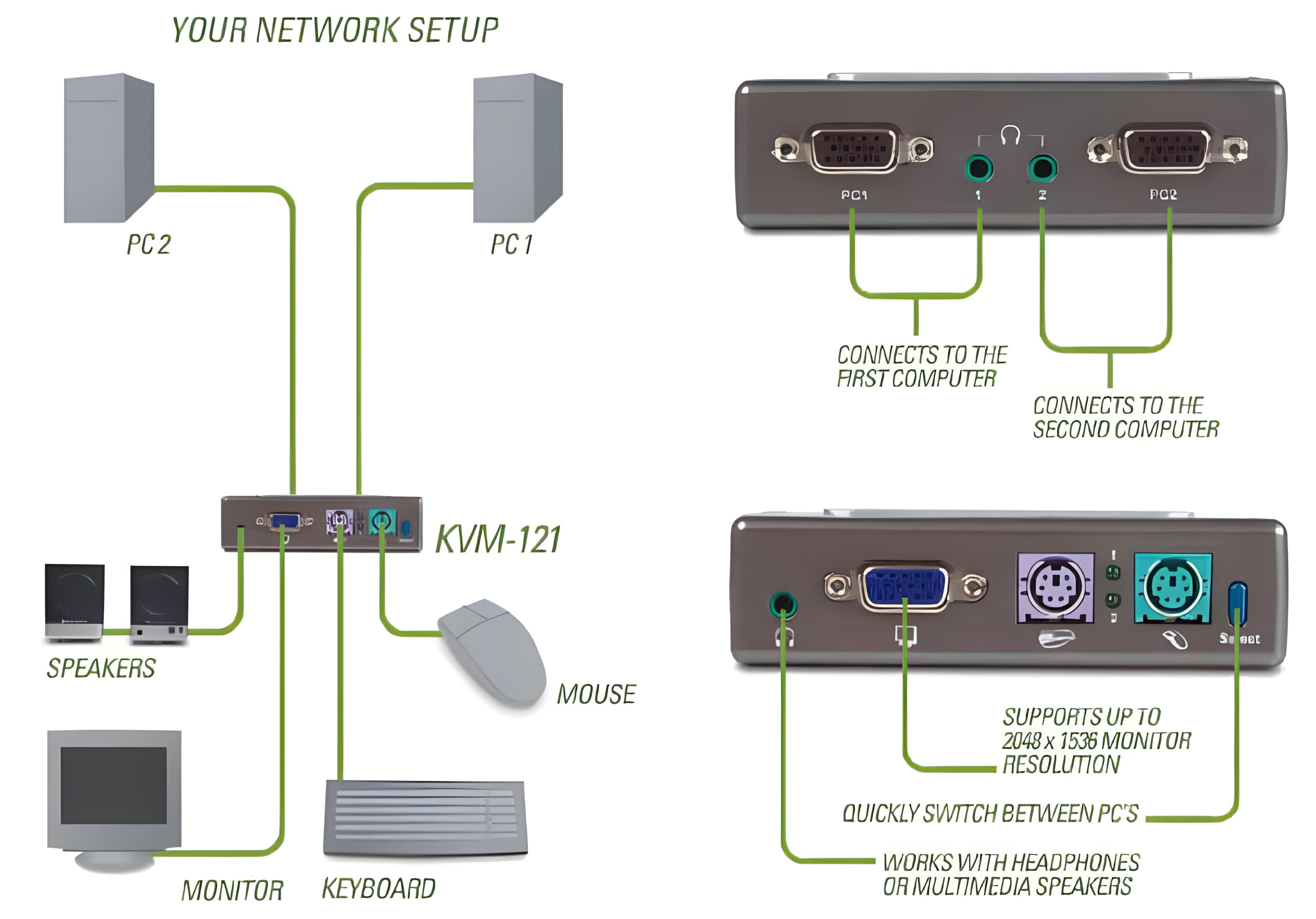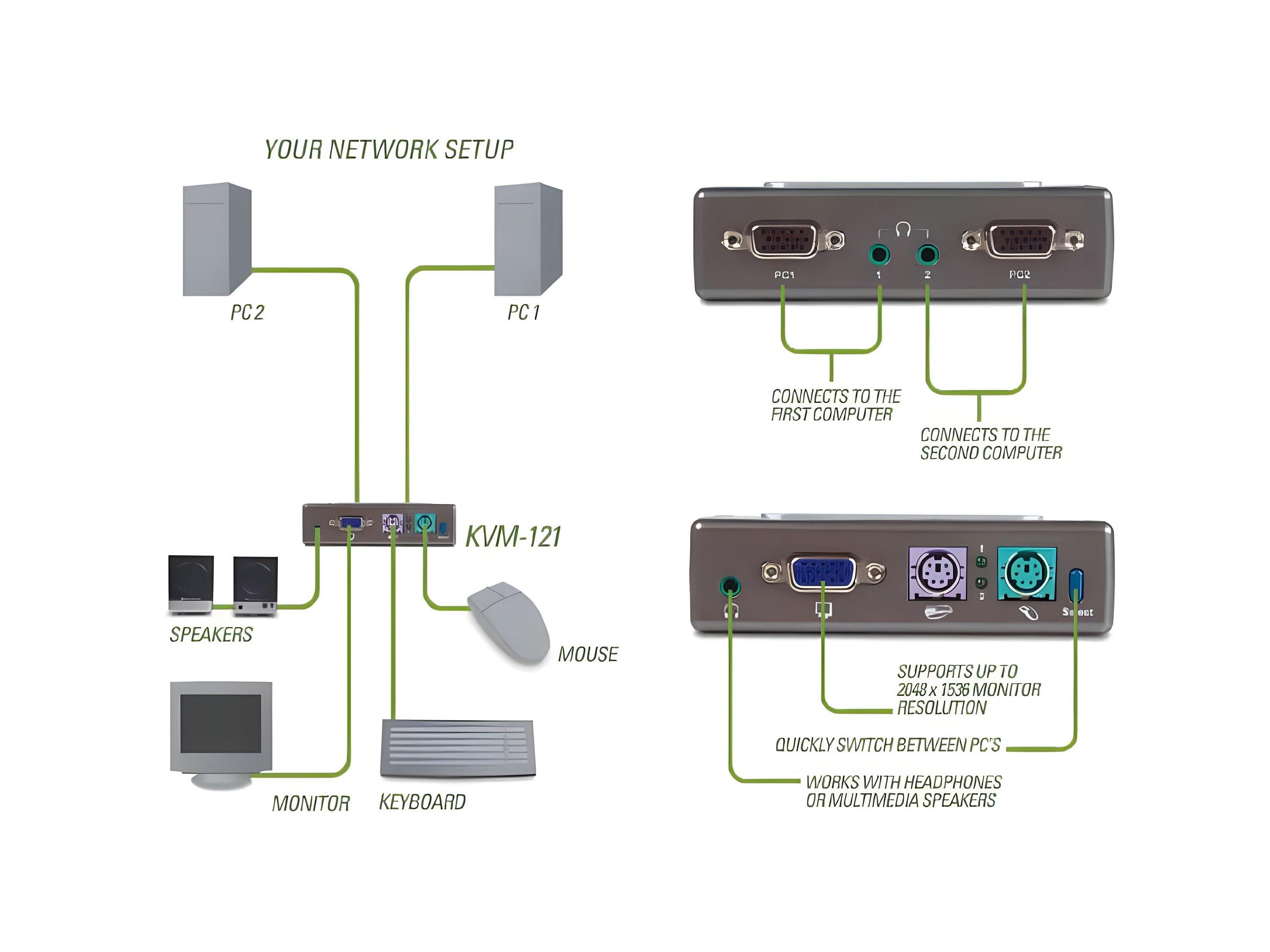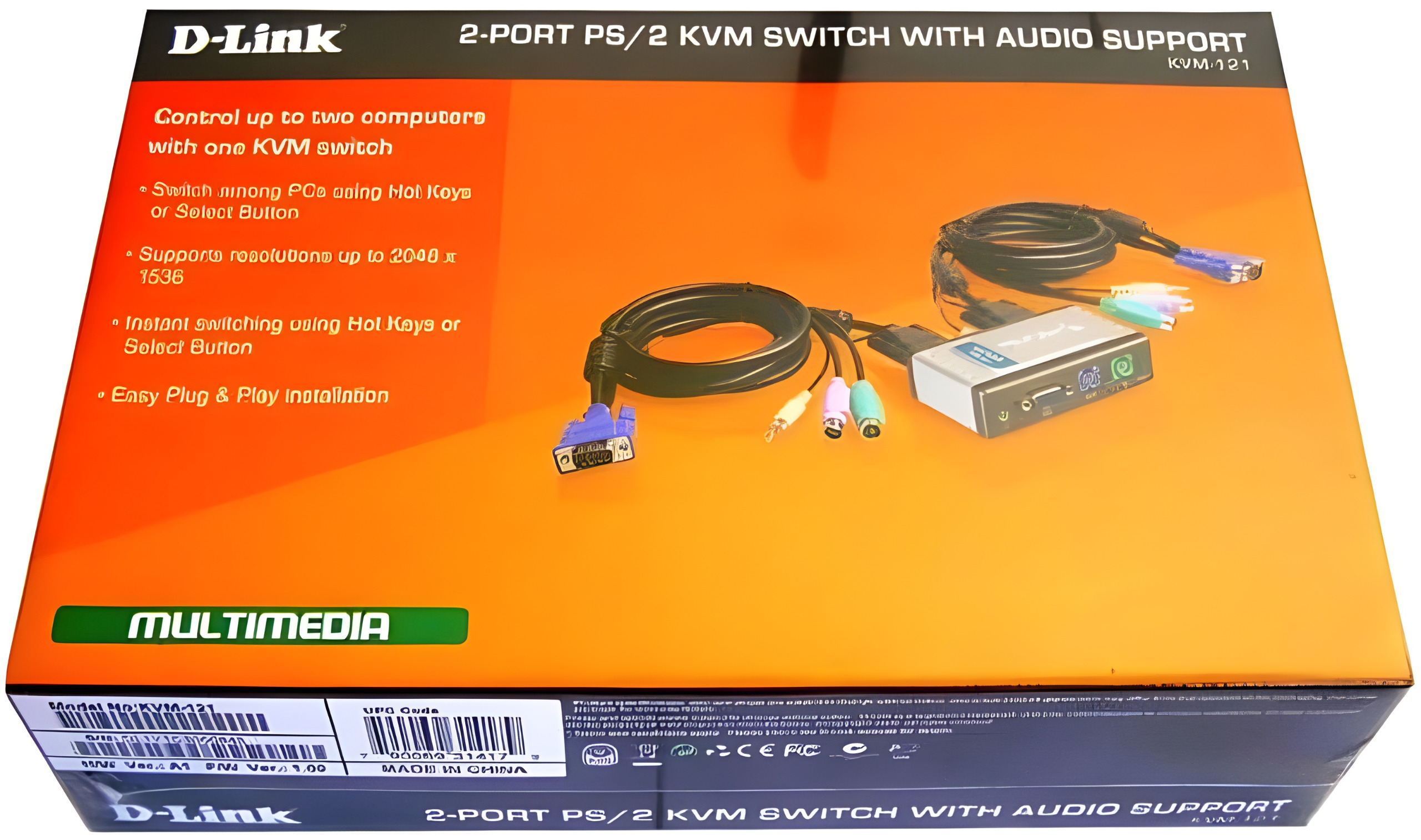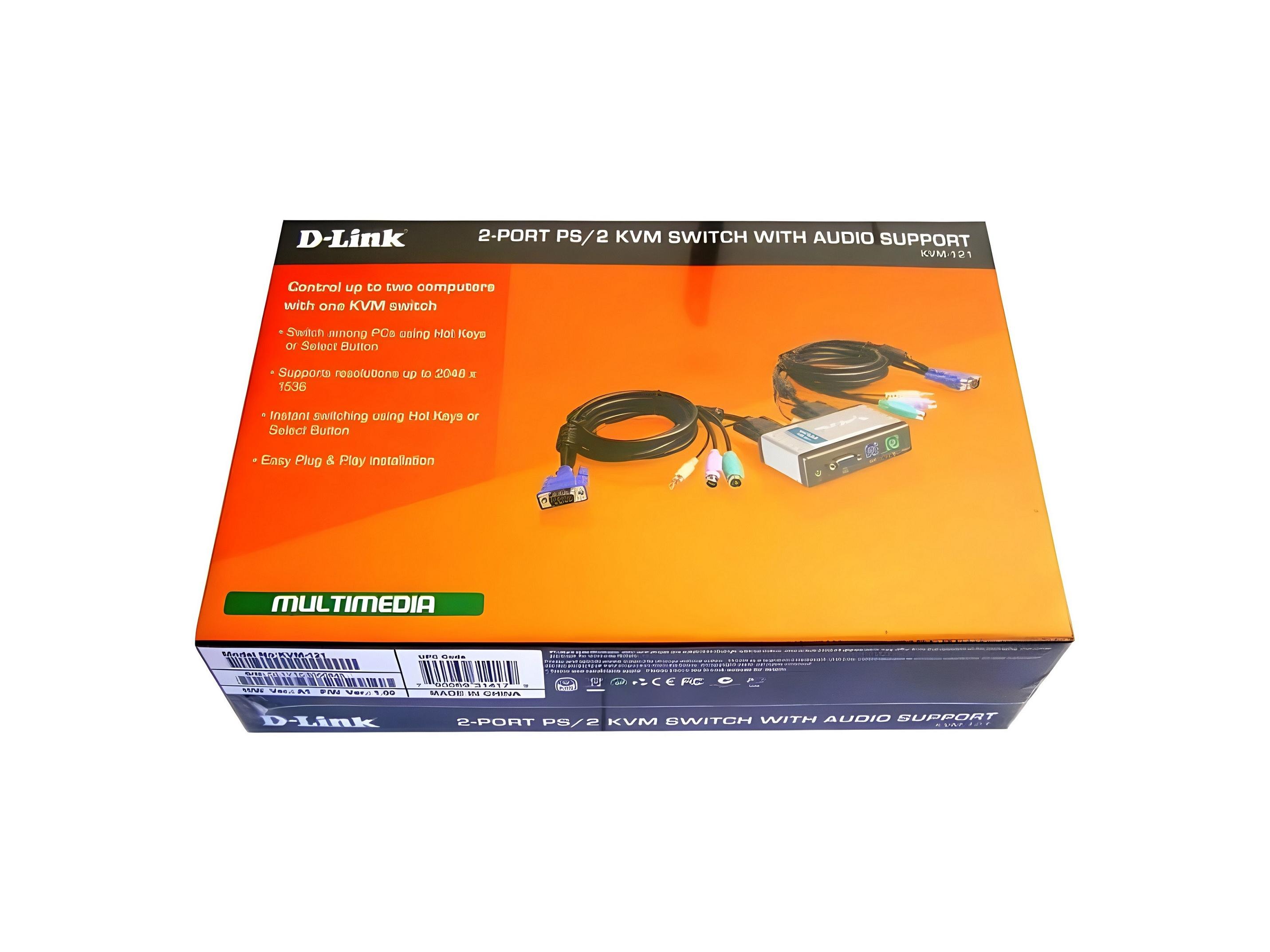 دی لینکKVM-121 یک محصول به صرفه و کارآمد برای استفاده در دفتر کار و منزل است. KVM-121 به شما این امکان را می دهد تا به آسانی به دو عدد کامپیوتر یک ماوس، کی بورد، مانیتور و اسپیکر متصل نمایید. بنابراین شما میتوانید با اتصال این محصول به دو کامپیوتر، هردوی آنها را از طریق یک ماوس، کی بورد و مانیتور کنترل نمایید و صدای خروجی دو کامپیوتر را از طریق یک اسپیکر بشنوید. KVM-121 از رابط PS/2 برای اتصال ماوس و کیبورد و رابط VGA برای اتصال مانیتور و جک 3.5 میلیمتری برای اتصال اسپیکر بهره می برد.