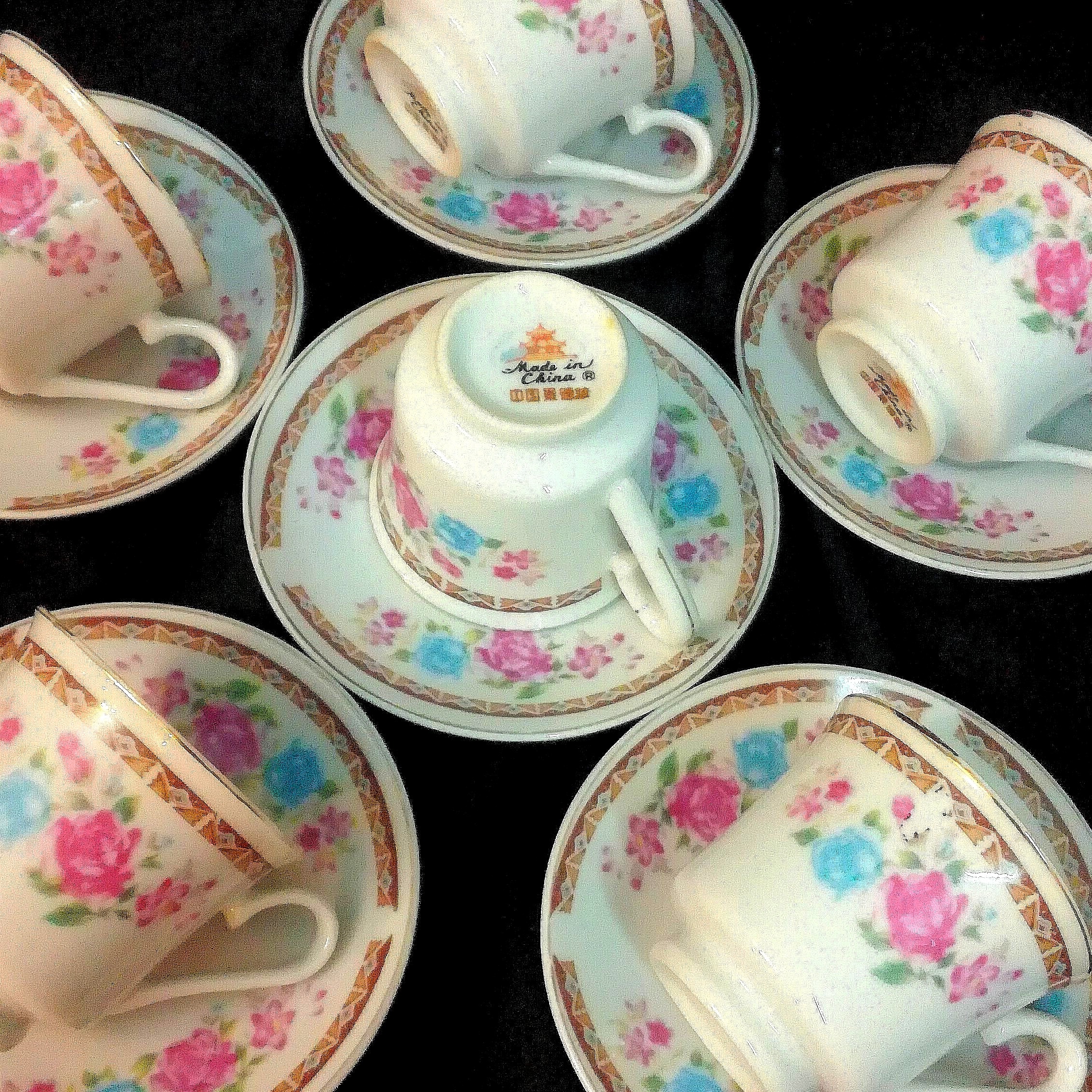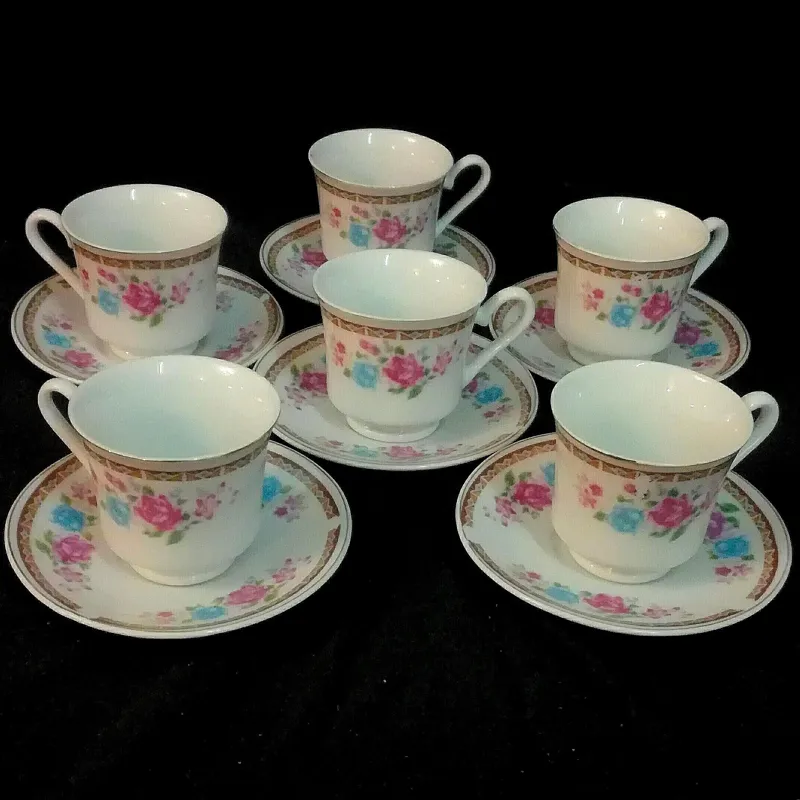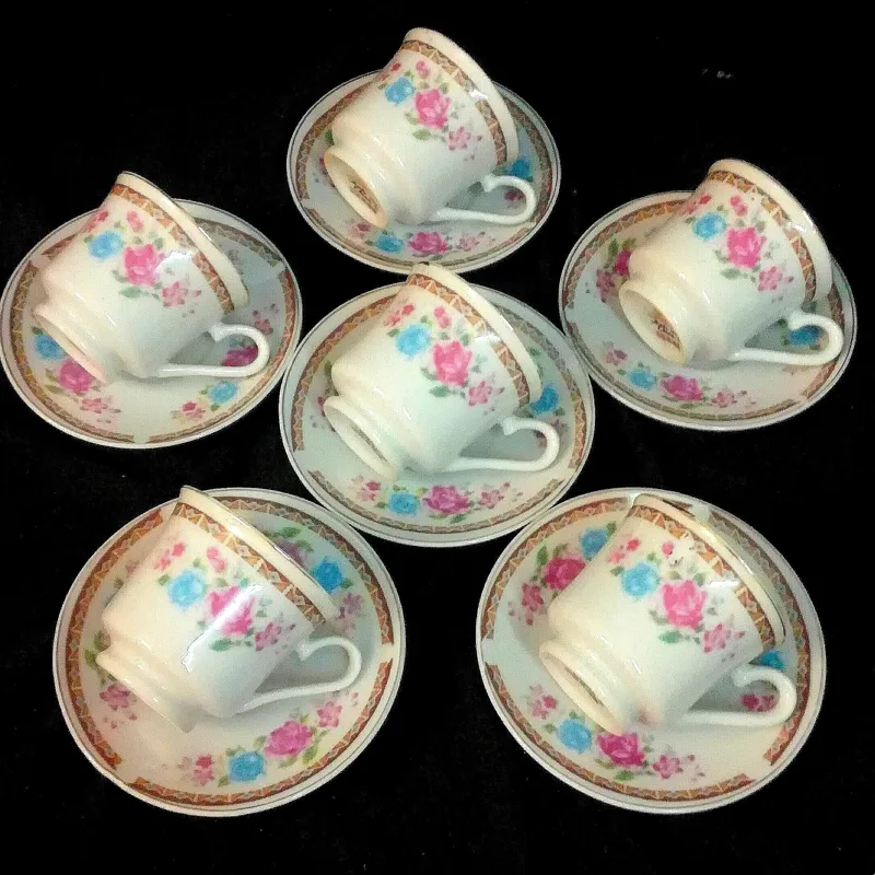 یکدست قهوه خوری گل ترمه قدیمی مارک کلبه بافنجانهای پایه دار کمیاب. اکثر فنجانهای گل ترمه ته صاف هستند و فنجان پایه دار آن بسیارکمیاب است. ارتفاع فنجان 5/5 سانتیمتر،قطردهانه 6سانت وقطر نعلبکی 11سانت میباشد،کاملاسالم ودرحدنو.قیمت درج شده برای یکدست (6عدد)میباشدوهمین 1دست موجود است.