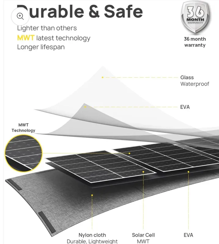 ضد آب و بادوام: سطح ضد آب این پنل خورشیدی IP65 است که میتواند به طور موثر ضد آب باشد و به طور کامل از شما پشتیبانی کند تا 24 ساعت شبانه روز در فضای باز از آن استفاده کنید. یک جیب به پنل خورشیدی مجهز شده است که میتواند برای ذخیره سیمهای برق و محافظت از پورتهای شارژ USB، Type-C و غیره استفاده شود.