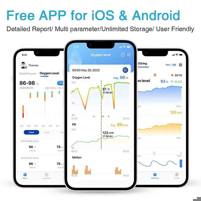نظارت بیسیم مداوم: حلقههای هوشمند SleepO2 میتواند به طور مداوم میزان اشباع خون و ضربان قلب شما را کنترل کند، گزارشهای روند را در برنامه یا نرمافزار رایانه شخصی ایجاد کند، گزارشهای وضعیت سلامتی شما را با جزئیات نشان میدهد. میتوان گزارشهای خود را در قالب PDF