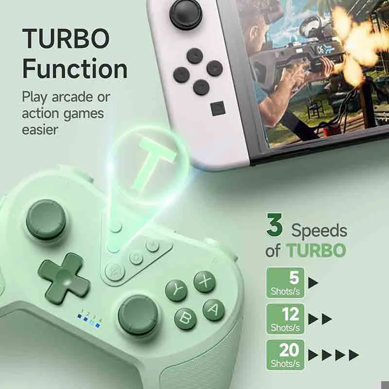 ژیروسکوپ 6 محوره و توربو دوگانه دسته بازی بیسیم EasySMX T37 برای Switch Pro دارای یک حسگر ژیروسکوپ 6 محوری برای کنترل دقیق حرکت است که به آن دسته میدهد شیب را تشخیص داده و پاسخهای سریع ارائه میدهد. موتورهای ویبره دوگانه، بازخورد شوک به موقع ارائه میدهند و یک تجربه بازی واقعیگرایانه را میدهند.