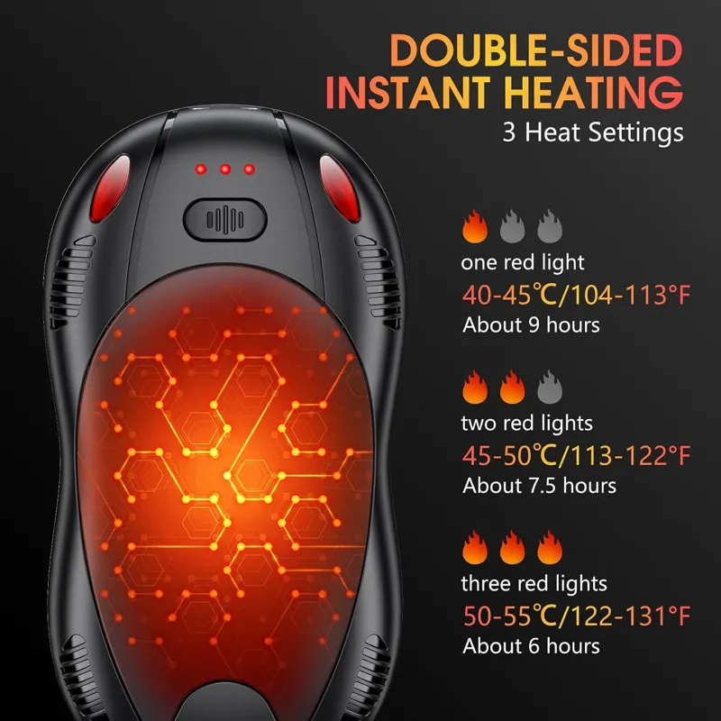 3 حالت گرم قابل تنظیم - گرمکن دست قابل استفاده مجدد با 3 درجه گرمایش. میتوانید بین 3 سطح دما را انتخاب کنید: کم (40~45)، متوسط (45~50) و زیاد (50~55). زمان کارکرد 9 ساعت، 7.5 ساعت یا 6 ساعت است که برای زمستانهای سرد نیاز است.