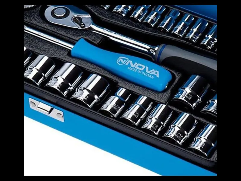 برای باز کردن مهرههای ششگوش، علاوه بر آچارهای تخت و رینگی از آچار و سری بکس هم استفاده میشود. استفاده راحتتر از آچارهای بکس باعث بهکارگیری بیشتر این ابزار نسبت به آچارهای تخت و رینگی، آچارفرانسه و غیره شده است. شرکت «نووا» (Nova) چند ست از این نوع آچار را تولید میکند. مدل NTS-7002 ازجملهی محصولات شرکت نووا محسوب میشود. این مدل با طرح سریهای بکس ششگوش تولید میشود. این مدل دارای 35 سری بکس با درایوهای ¼ و 8/3 اینچ است. سوکتهای درایو ¼ اینچ، شامل 9 سری با استاندارد SAE یا اینچی و 9 سری با استاندارد متریک میشوند. همچنین سریهای درایو 8/3 اینچ، شامل 9 سری با استاندارد متریک و 7 سری با استاندارد SAE میشوند. در کنار سریهای بکس این محصول یک سری بکس شمارهی 16 بلند (مخصوص باز کردن شمع خودرو)، یک آچار بکس جغجغهای، یک دستهی بکس پیچگوشتی و یک اضافه شوندهی طول با اندازهی 70 قرار دارند. جنس بهکاررفته در ساخت آچارها، سریهای بکس و سایر محتویات مدل NTS-7002 از آلیاژ کروم-وانادیوم است. بهکارگیری این آلیاژ در ساخت ابزار، باعث بالا رفتن مقاومت آنها در برابر ضربه، حرارت و فشار خواهد شد و از زنگزدگی هم جلوگیری میکند. سریهای 6 گوشهای کاملا بر روی مهره قرار میگیرد و بیشتر برای استفادههای عمومی و مواردی که نیاز به فشار و نیروی زیاد برای باز کردن مهره نداشته باشیم، کاربرد دارد. شرکت نووا این مدل و محصول 39 عددی را در یک جعبهی فلزی ارگانیزه بسیار محکم و در ابعاد5×15×32 سانتیمتر تولید کرده است