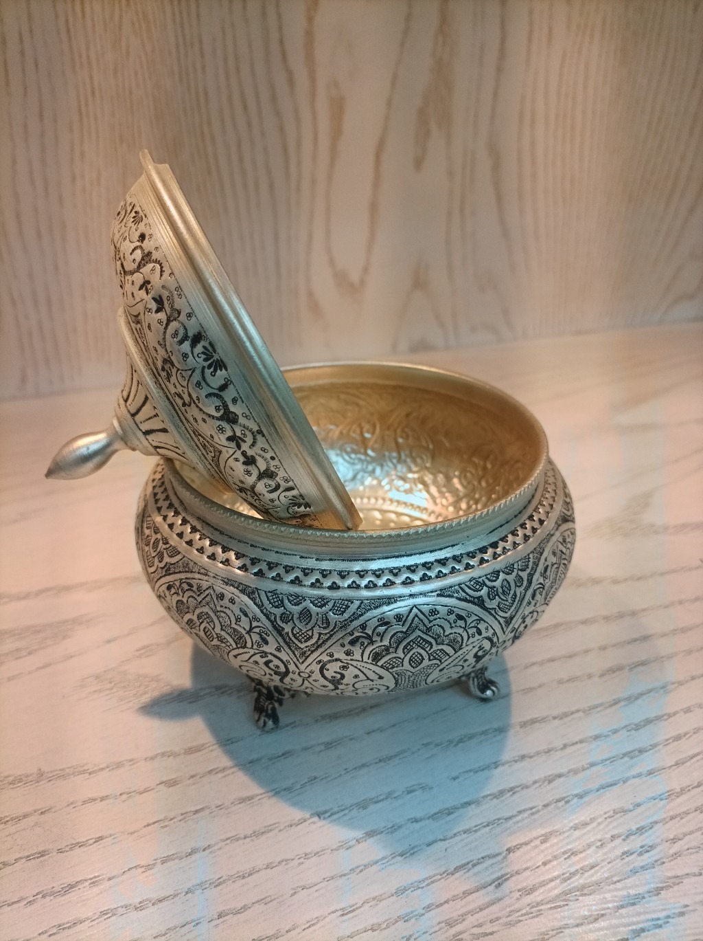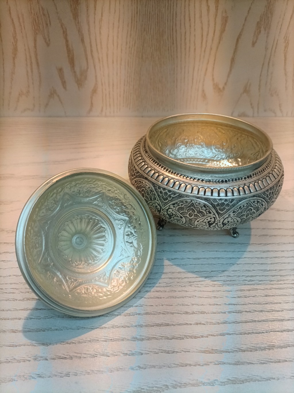 بدنه ظرف گرد و خوشفرم است و روی سه پایه کوچک ظریف قرار گرفته که جلوهای سنتی و اصیل به آن میبخشد. سطح شکلاتخوری با نقوش قلمزنی سنتی ایرانی تزئین شده؛ طرحهایی اسلیمی و گیاهی که با دقت و هنرمندی فراوان حکاکی شدهاند. درب گنبدیشکل آن با نوک تیز مخروطی و ریزنقشهای قلمزنی هماهنگ با بدنه، زیبایی ظرف را کامل کرده است. رنگ نقرهای و سیاهقلم (پرکردن شیارهای حکاکی با رنگ تیره) تضاد چشمنوازی ایجاد کرده و باعث میشود جزئیات طرحها بیشتر دیده شوند. این شکلاتخوری، علاوه بر کاربردش بهعنوان ظرف پذیرایی، یک اثر هنری و دکوراتیو محسوب میشود که میتواند زینتبخش ویترین، بوفه یا میز پذیرایی باشد.