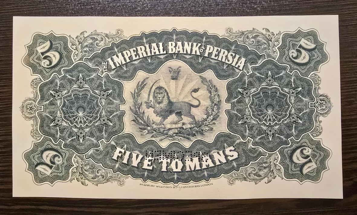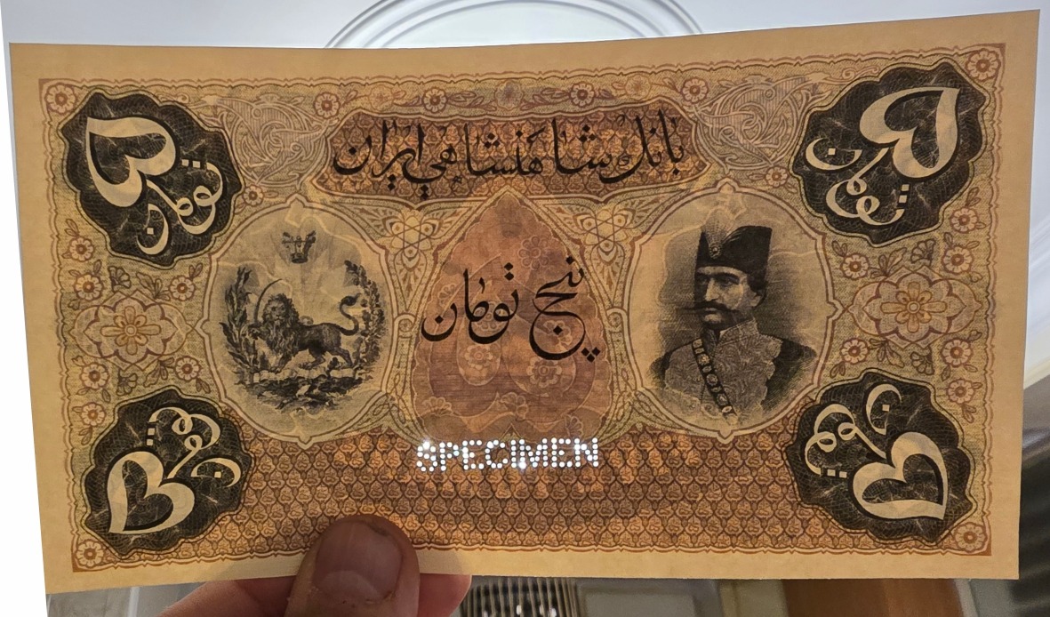پنج تومان سری اول ناصرالدین شاه قاجار اسپسیمن پشت سبز بدون امضا.بسیار بسیار کمیاب و ارزنده، طرح و کپی این اسکناس از نسخه اصلی در انگلستان انجام شده و اندازه اصلی اسکناس میباشد.اصل این اسکناس بالای 600 میلیون تومان ارزش دارد.