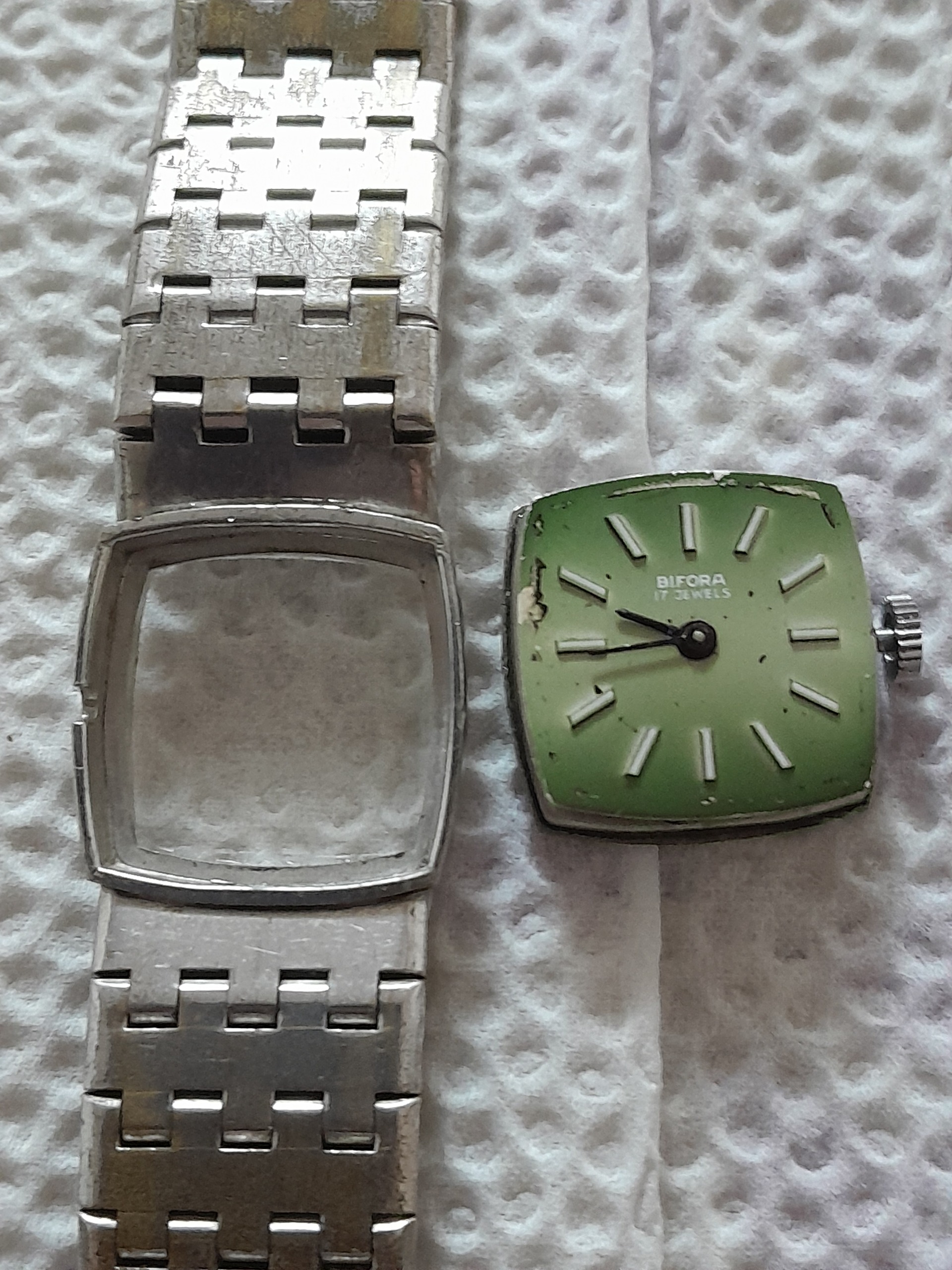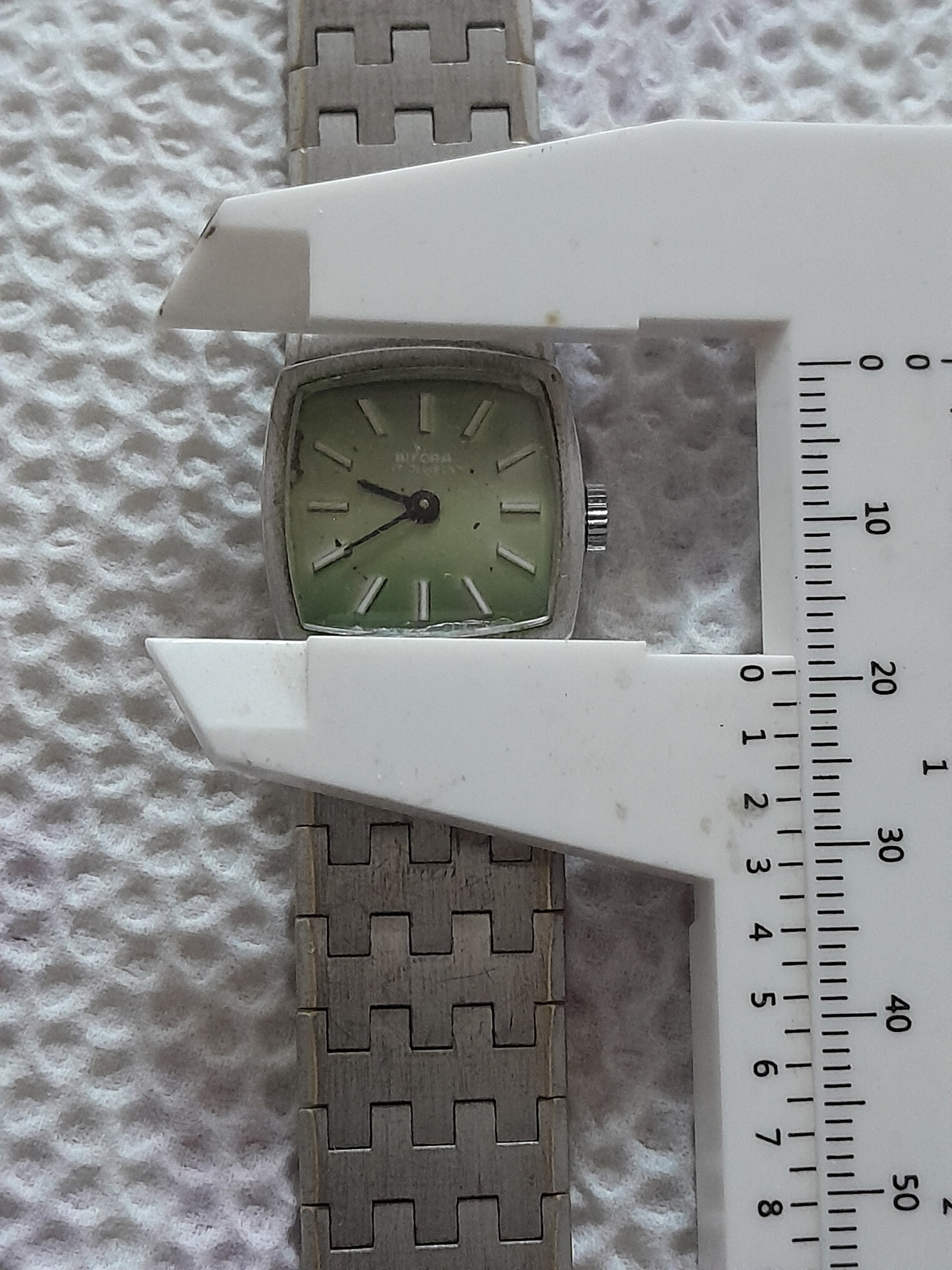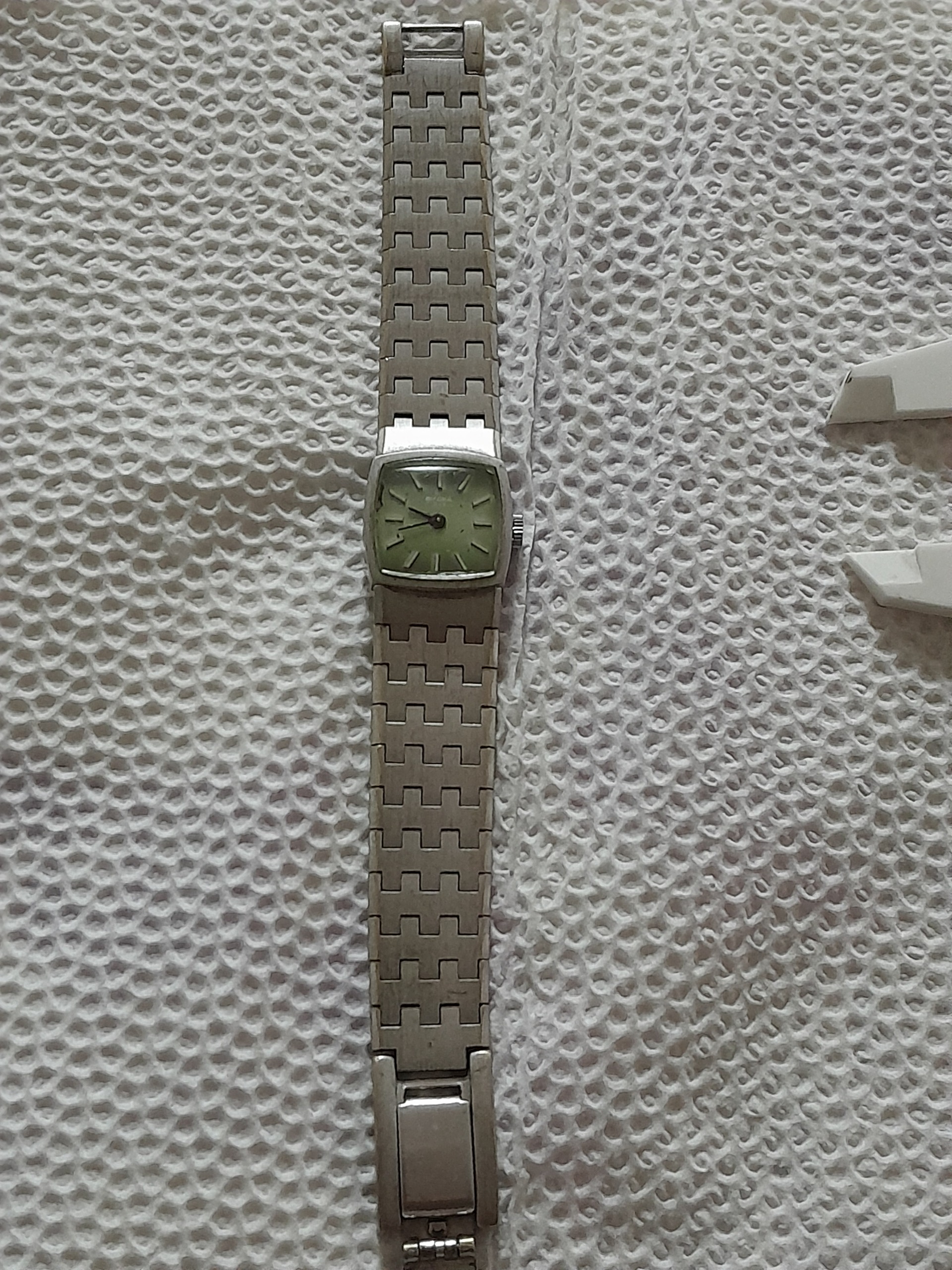 این ساعت کوکی با روکش طلای سفید در حال کار اصلی سوئیسی با اندازه 16سانتیمتر قد کل با صفحه زیبای رنگ سبز. چشم سبز مانند با موتور تازه سرویس شده است این ساعت دارای 17سنگ یاقوت است و اینکابلاک یعنی. مقاوم در برابر شوکهای وارده به رقاصک است.