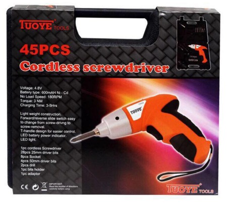 پیچ گوشتی شارژی فوق یکی از محصولات تولیدی شرکت «تیو» (tuoye) است. یکی از مهمترین ویژگیهای این محصول تعداد بالای سریهای پیچگوشتی آن است که در اشکال مختلف دوسو، چهارسو، دوازدهگوش، ستارهای، آلنی، چهارگوش،بکسی و... طراحی شدهاند. با وجود این مجموعه بسیاری از پیچ و مهرههای مختلف را میتوان باز و بسته کرد. این سریهای پیچگوشتی روی پیچگوشتی شارژی نصب میشوند و هر کدام نقش یک پیچگوشتی مستقل را بازی میکنند. پیچگوشتی شارژی فوق برای تامین انرژی به یک باتری شارژی نیکل کادمیومی مجهز است که ولتاژی برابر 4.8 ولت دارد. ظرفیت این باتری 600 میلیآمپر ساعت است و با کمک نشانگری که روی دستگاه تعبیه شده است، میتوان از میزان شارژ آن آگاه شد. از دیگر مزایای این محصول برای افزایش دید کاربر به لامپی الایدی مجهز شده است