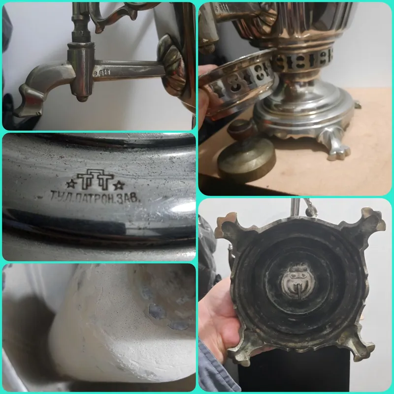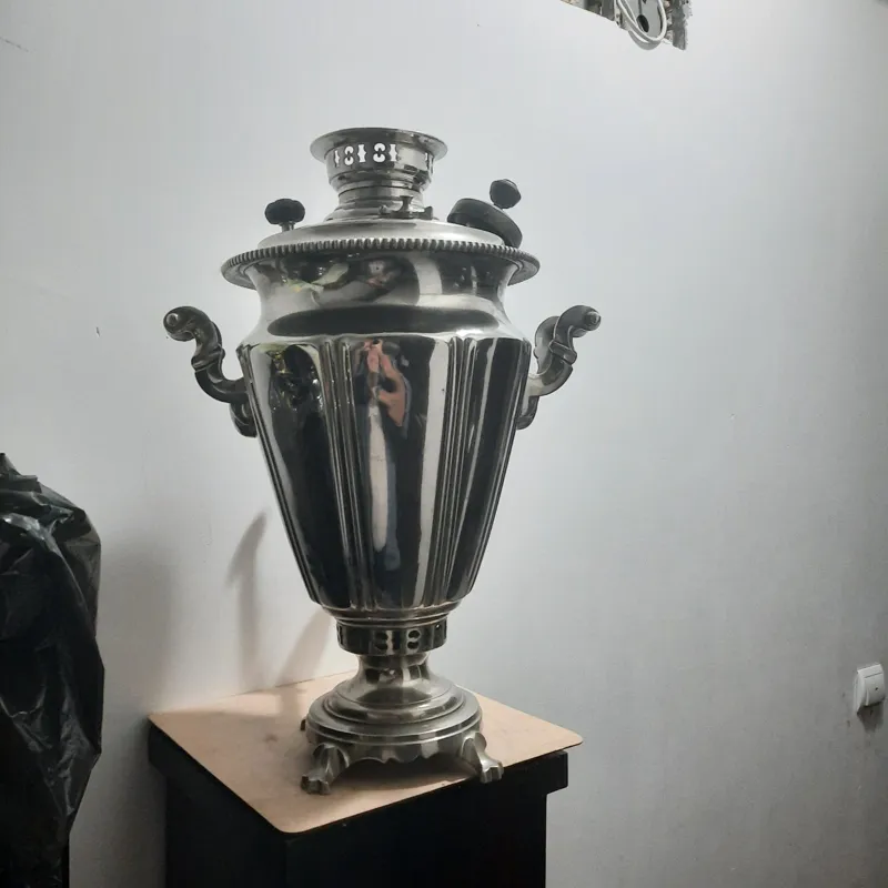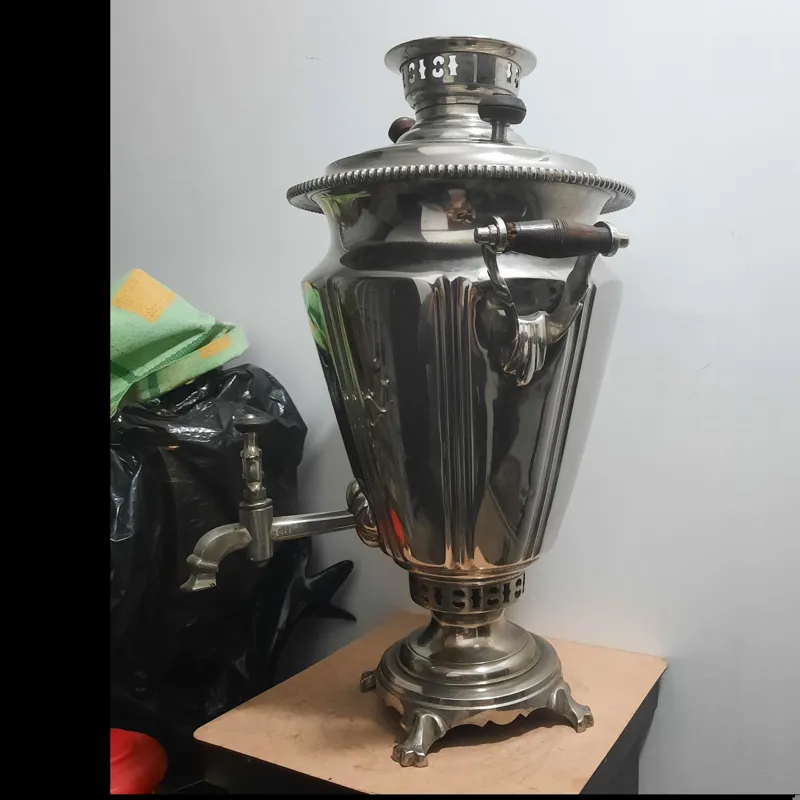 سماور فوق العاده زیبا و کم نظیر اصل روسی دارای مهر روسی روی درب و شماره حک شده روی شیرش اندازه 8 لیتری ارتفاع 52 سانت وزن دقیقا 7/100 بکر و سنگین به شرط اصل روسی و قدیمی