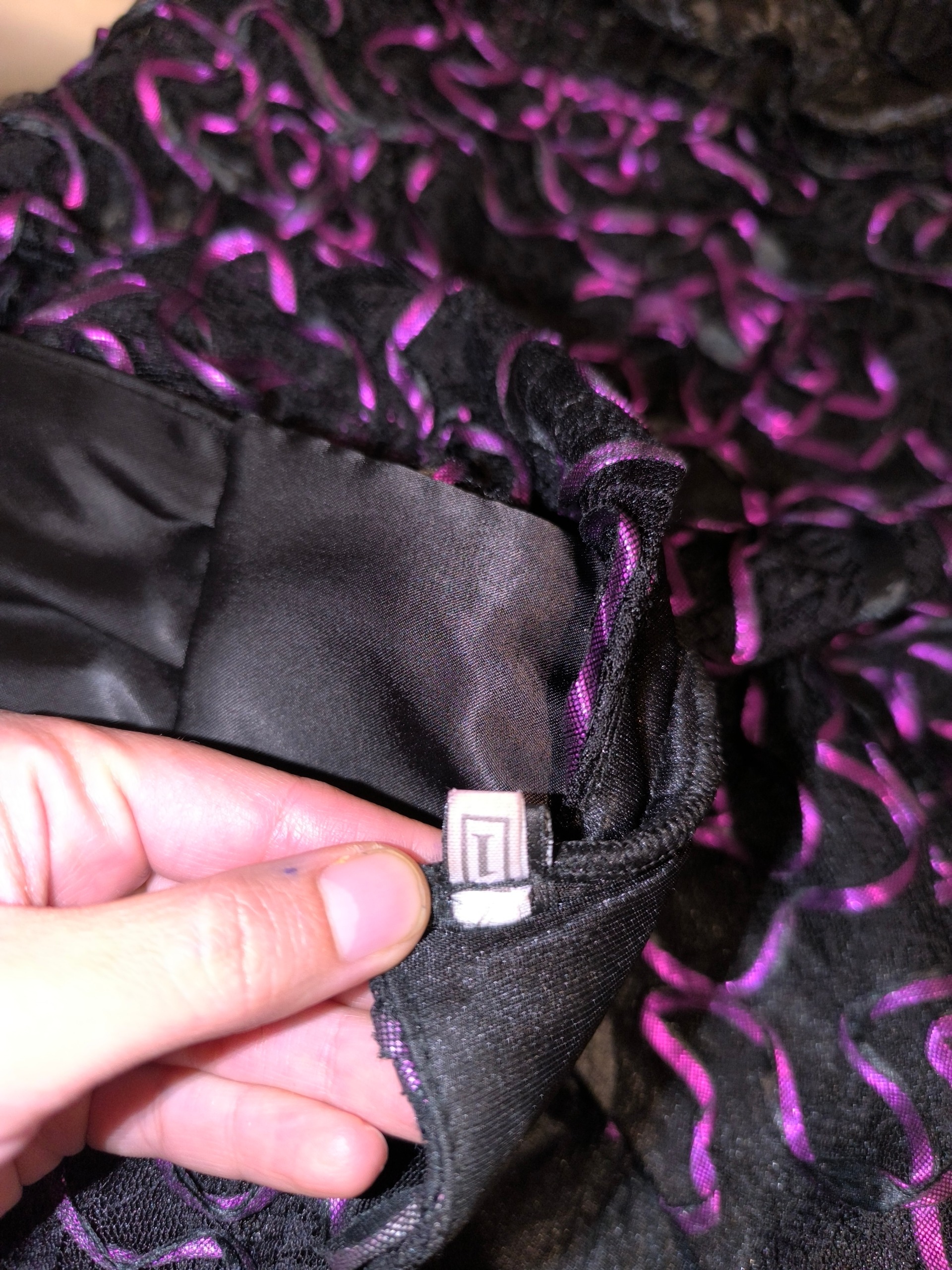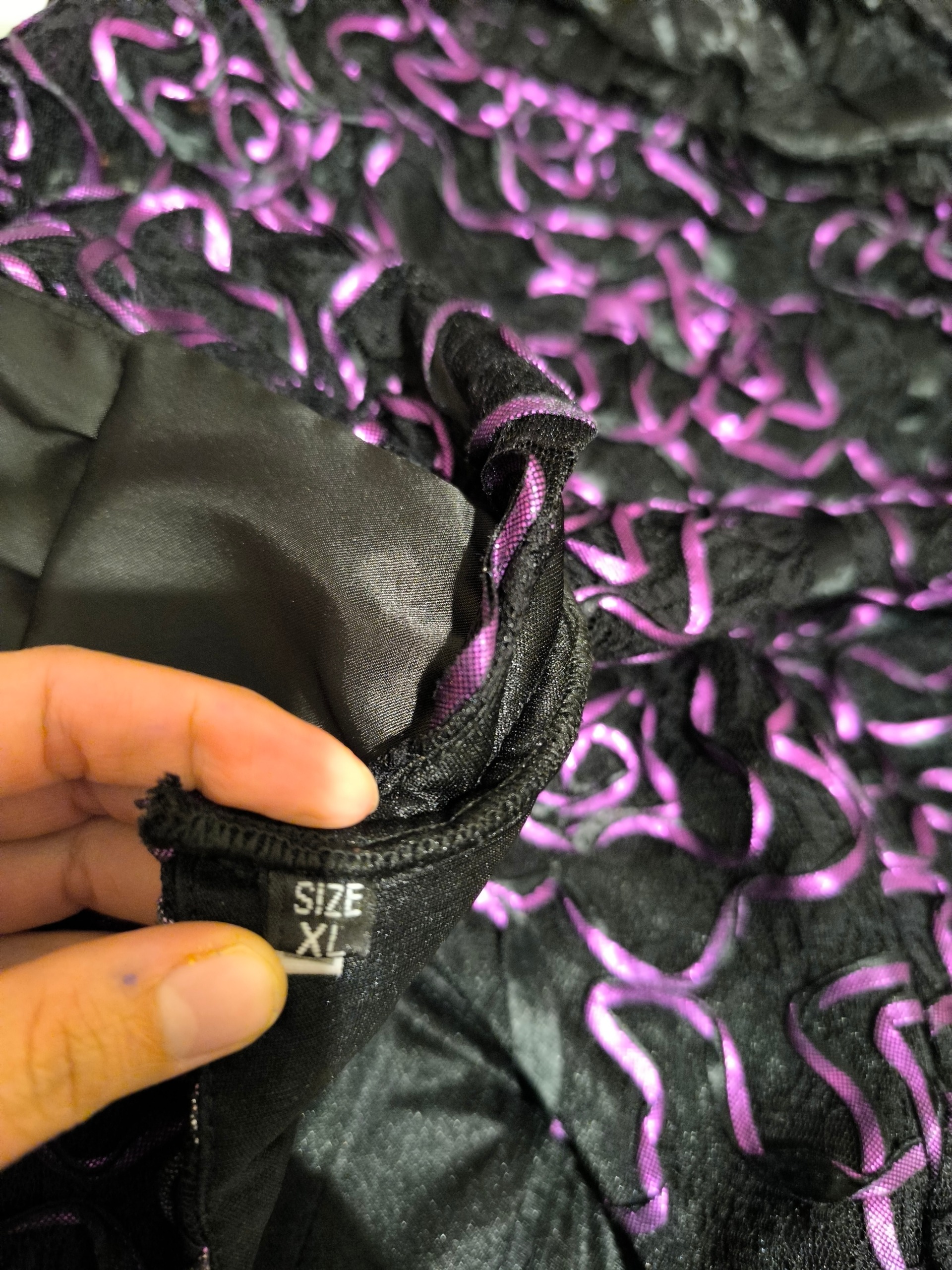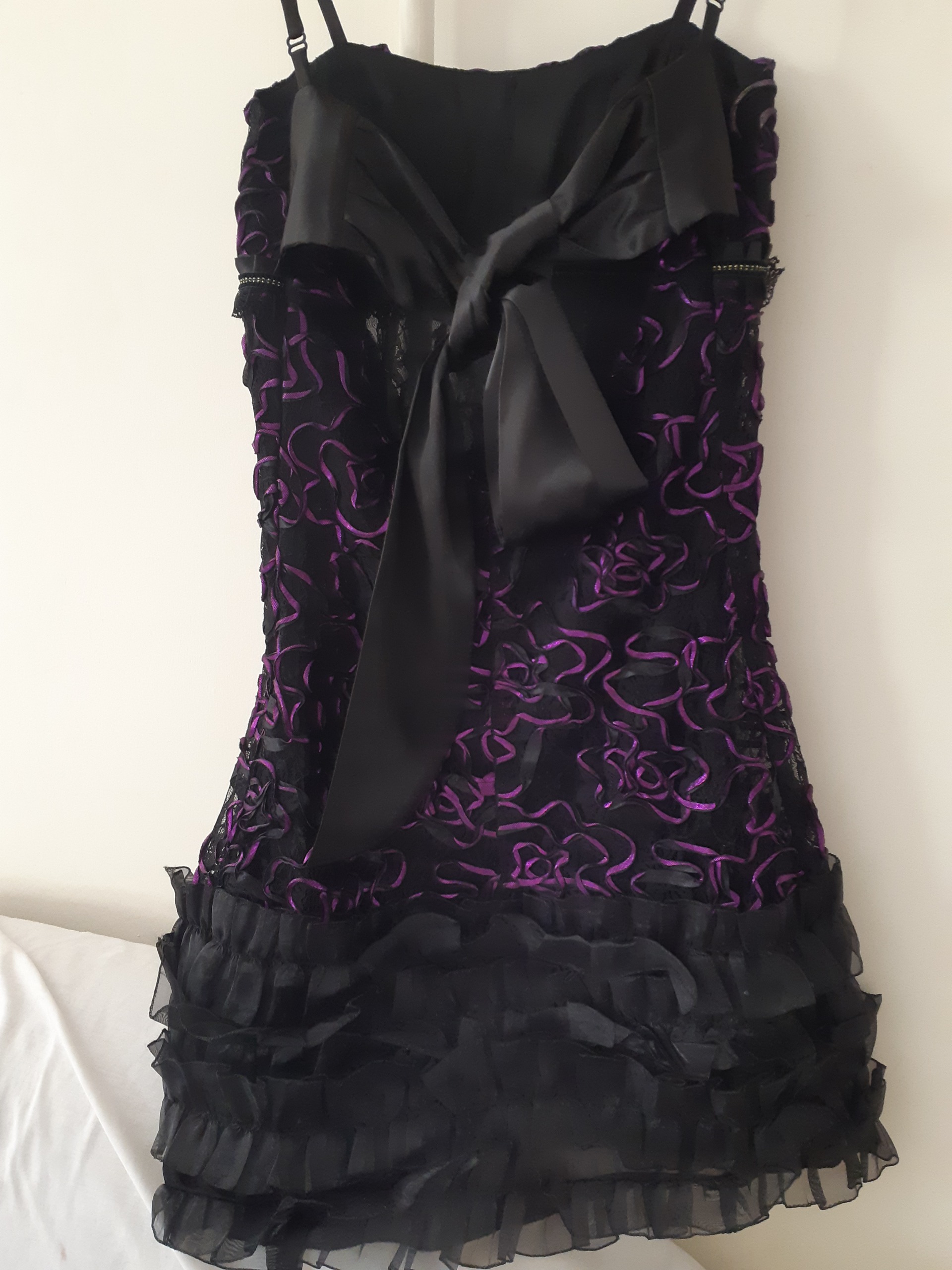 پایین لباس مدل چین دار و روی لباس گل های برجسته بنفش کار شده هم پشت لباس پاپیون میخوره و قابلیت تنگ و گشاد شدن لباس داره وهم بند داره و میتونه کوتاه یا بلند بشه بسیار شیک و فقط یکبار پوشیده شده