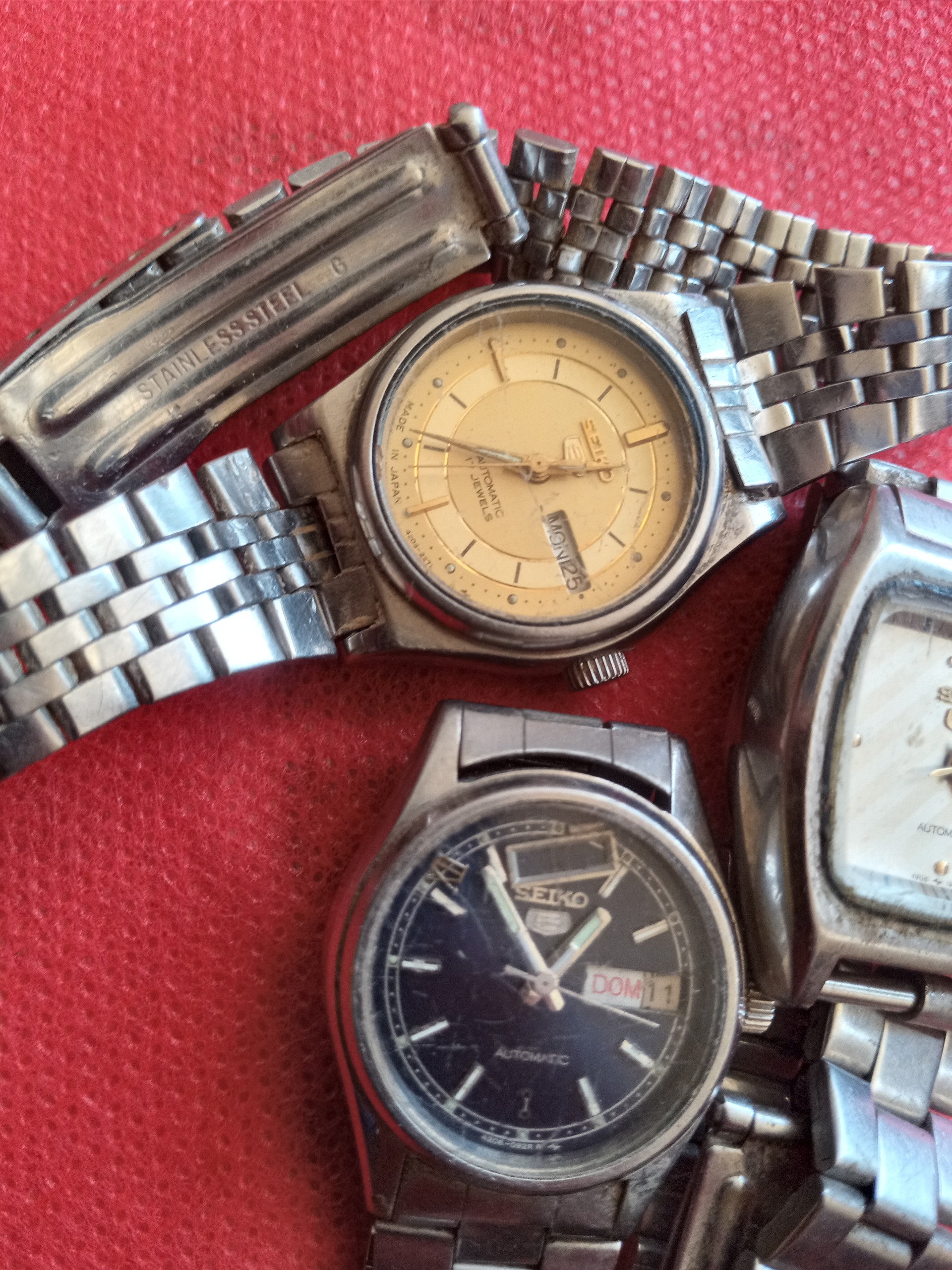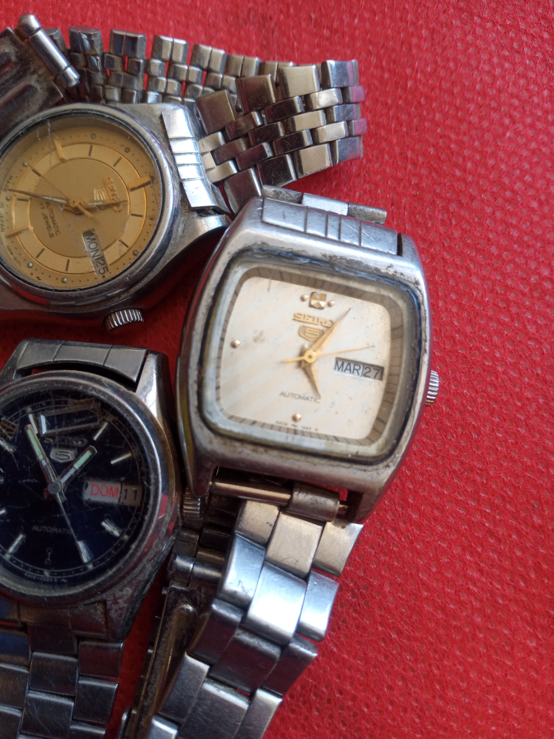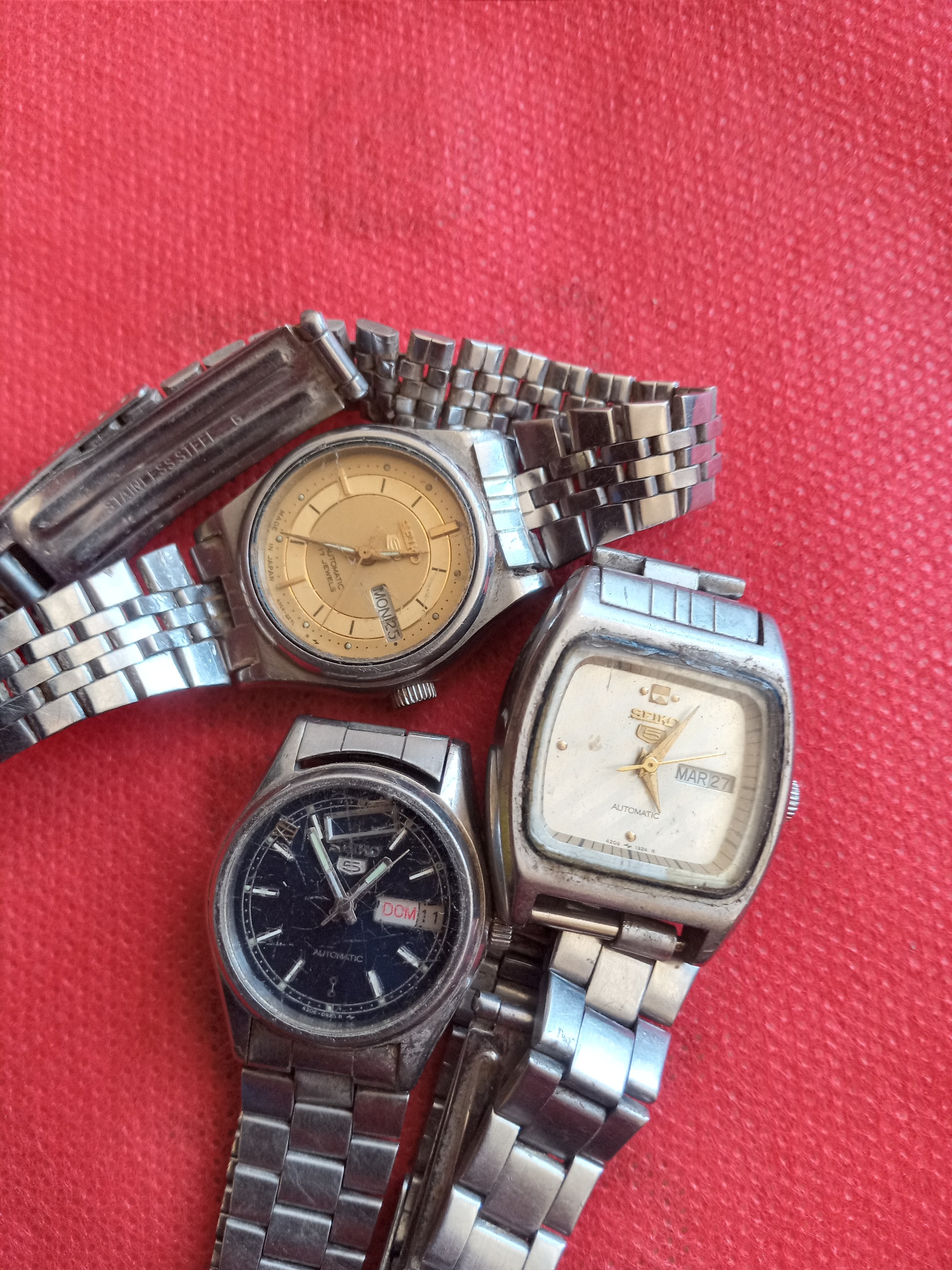 هرسه تا کار میکنه. صفحه گرد طلایی کار میکنه. صفحه سفید مربع تکون میدی کار میکنه.بندش از محل اتصال به ساعت از یه طرف نیست..تو عکسها دقت کنید. چند ثانیه بعد وابمیسه. صفحه گرد مشکی هم همینطور. تکون میدی کار میکنه باز وایمیسه. فرم دور تاریخ صفحه صفحه مشکی افتاده. صفحه ساعتهام خط وخش داره. همشون اصلی ان.همشون سرویس میخان. سوالی بود درخدمت.