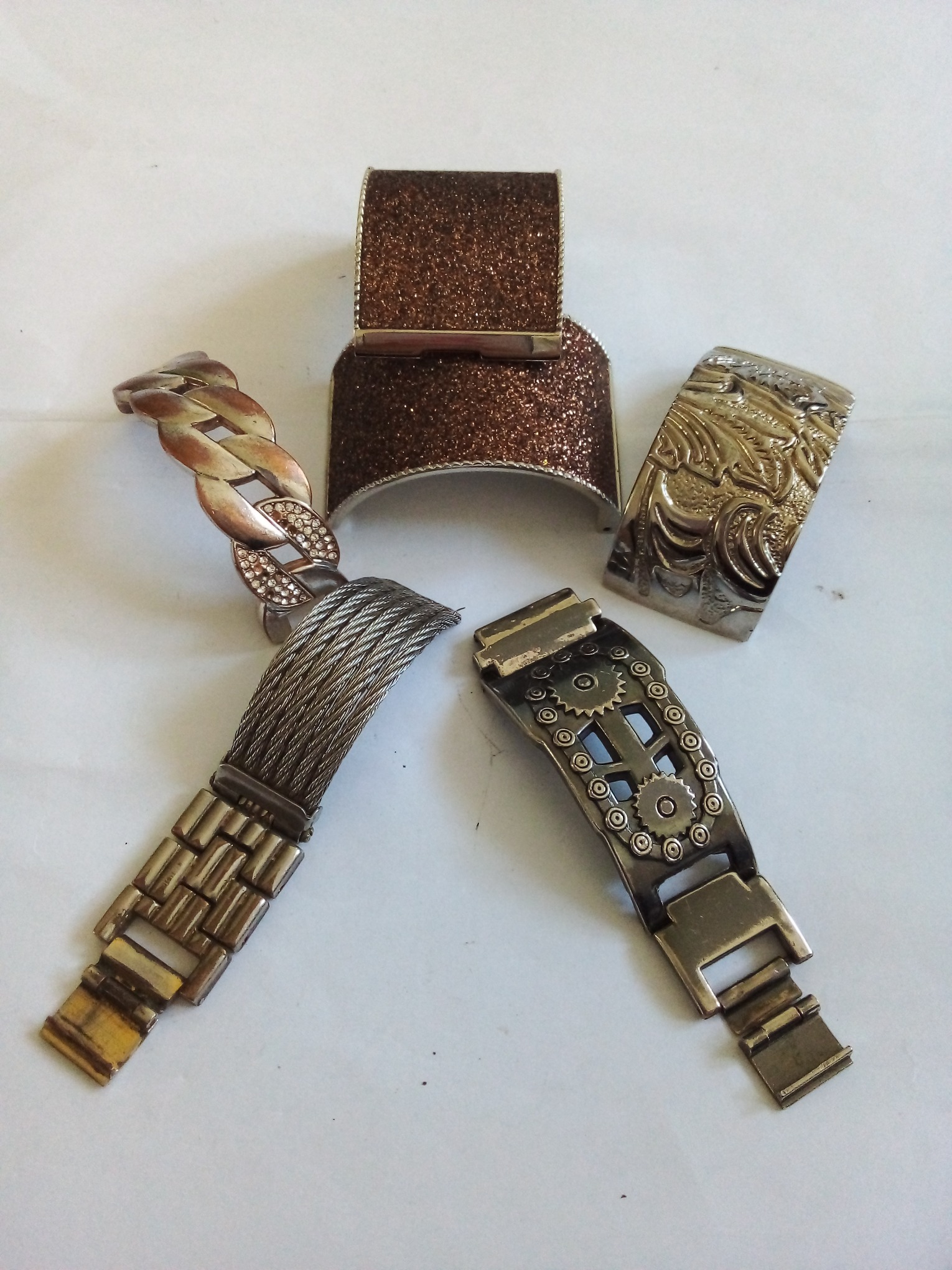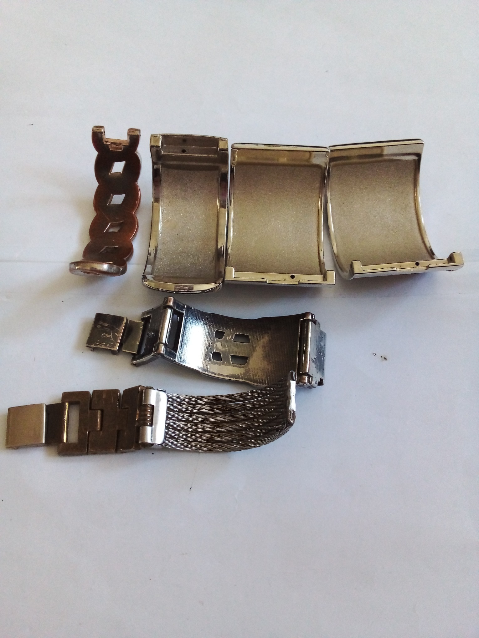 درود وروز بخیر خدمت عزیزان کاربر و سایت محترم ایسام . بندهای النگویی ساعت مچی 4 عدد از بندها ناقص فقط یک سمت ساعت هستند و2عدد قفل بند دارند . یکی از بندها که قهوه ای طلایی هست سالمه ،همه باهم وطبق تصاویر بفروش میرسد . عزیزان خریدار قبل از اقدام به خرید